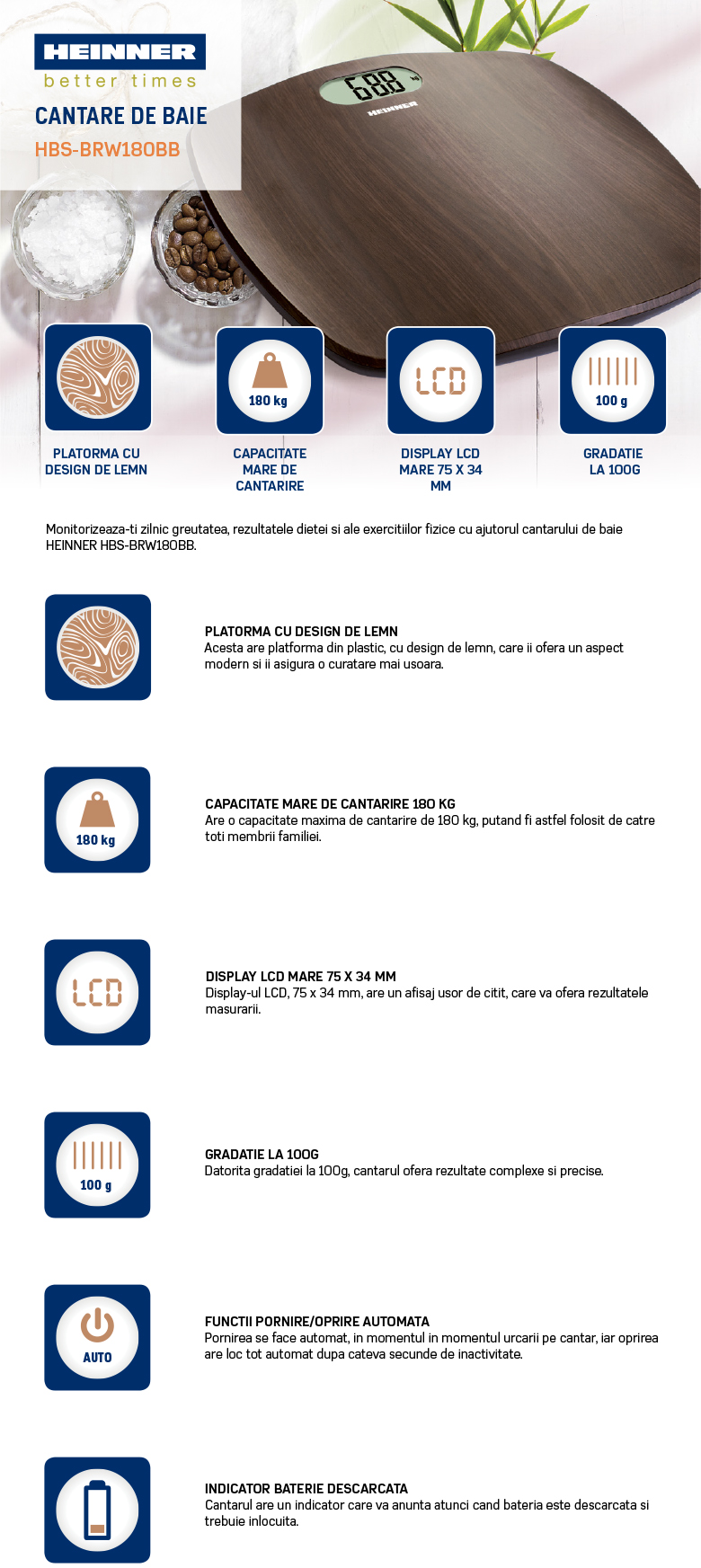 Cantar de baie Heinner Dark Bamboo 180 HBS-BRW180BB, platforma cu design de lemn, capacitate maxima: 180kg, display LCD, gradare: 100g, pornire /oprire automata, indicator baterie descarcata, baterii: 2xAAA