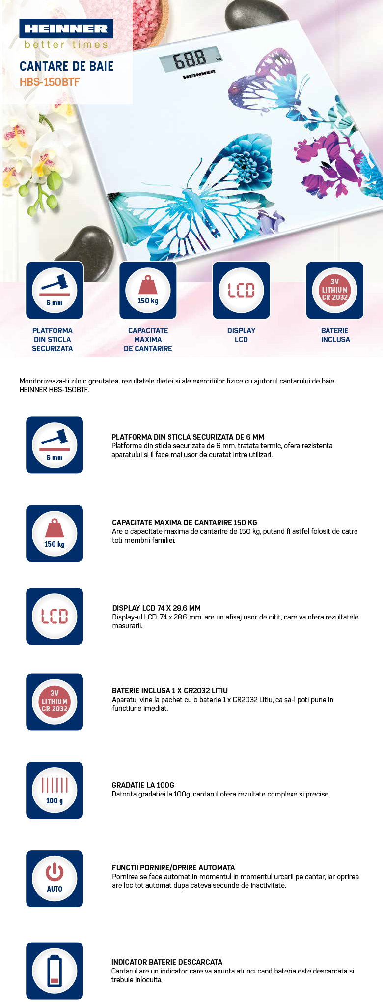 Cantar de baie Heinner Butterfly 150 HBS-150BTF, platforma din sticla securizata de 6 mm, capacitate maxima: 150kg, display LCD, gradare: 100g, pornire / orpire automata, indicator baterie descarcata, indicator depasire greutate, baterie inclusa: 1 x CR2032 Li