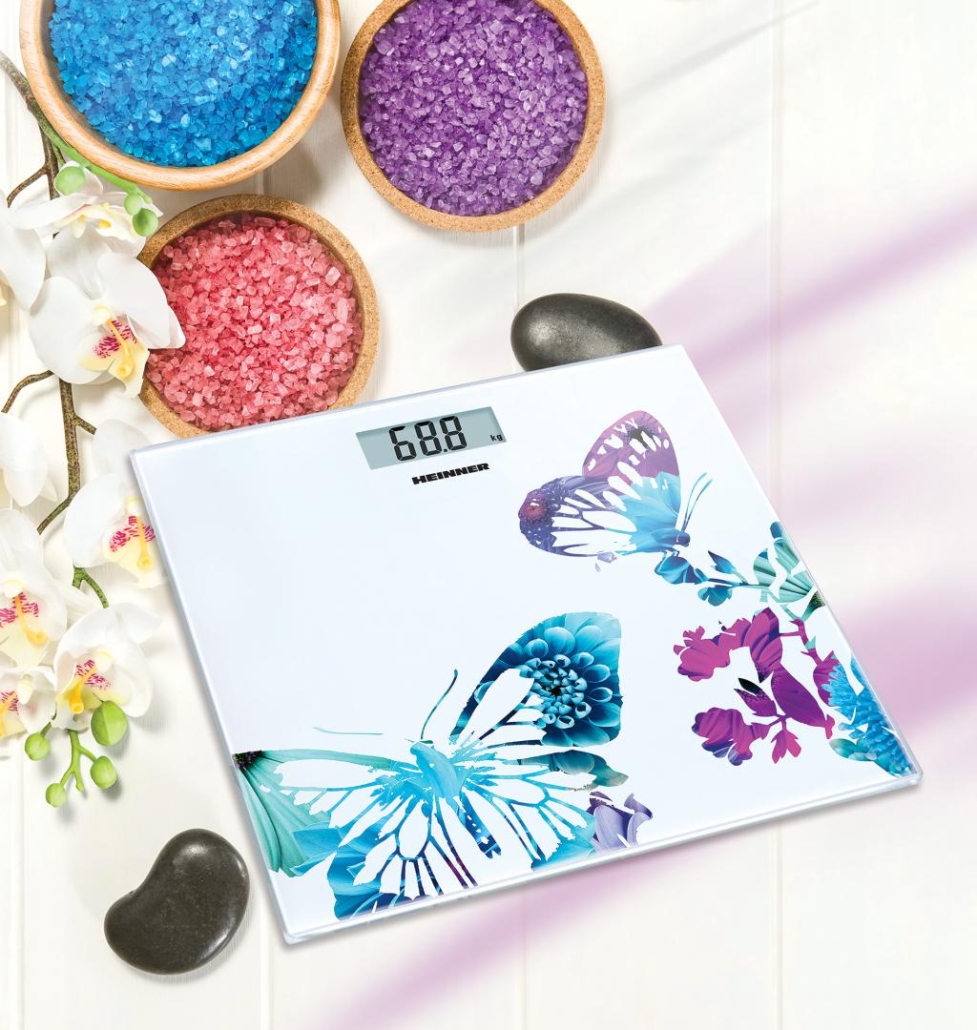 Cantar de baie Heinner Butterfly 150 HBS-150BTF, platforma din sticla securizata de 6 mm, capacitate maxima: 150kg, display LCD, gradare: 100g, pornire / orpire automata, indicator baterie descarcata, indicator depasire greutate, baterie inclusa: 1 x CR2032 Li