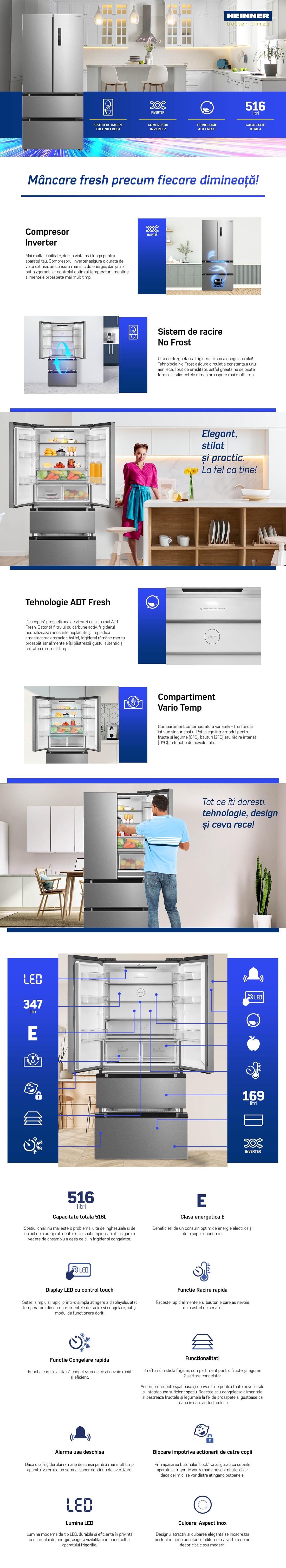 Combina frigorifica French Door Heinner HCFD-M516INVXE++, No Frost, compresor Inverter, clasa energetica: E, capacitate totala: 516 L, capacitate frigider: 347 L, capacitate congelator: 169 L, display LED cu control touch, functie Super racire, functie Super congelare, sistem ADT Fresh, alarma usa deschisa, Vario Temp. - Compartiment cu temperatura variabila, 2 rafturi din sticla frigider, compartiment pentru fructe si legume, 2 sertare congelator, lumina LED, capacitate de congelare: 12kg/24h, dimensiuni (LxAxI): 83.3 x 65.3 x 189.8 cm, culoare: Aspect inox