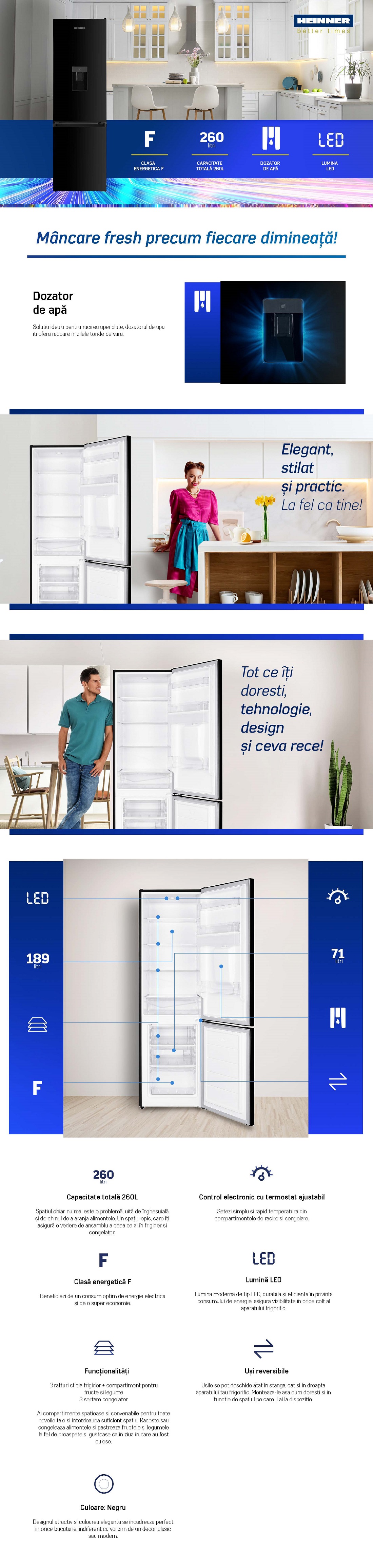 Combina frigorifica Heinner HC-HM260BKWDF+, clasa energetica: F, capacitate totala: 260L, capacitate frigider: 189L, capacitate congelator: 71L, control electronic cu termostat ajustabil, dozator de apa, lumina LED, 3 rafturi sticla frigider, compartiment pentru fructe si legume, 3 sertare congelator, usi reversibile, suport oua, tavita cuburi de gheata, capacitate congelare: 3.2kg/24h, dimensiuni (WxDxH): 55 x 56 x 180 cm, culoare: Negru