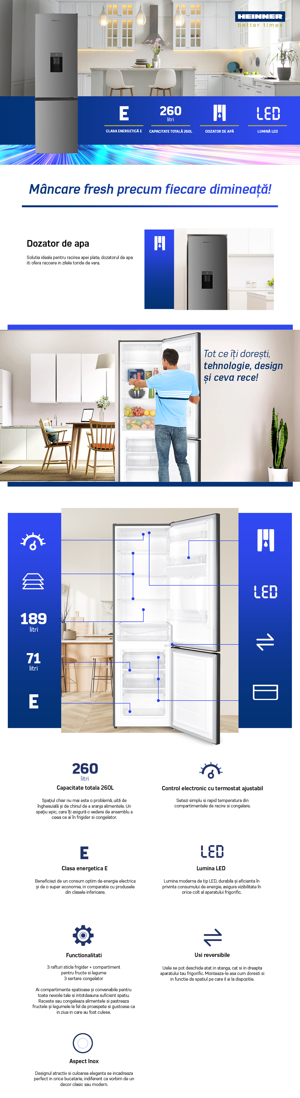 Combina frigorifica Heinner HC-HM260XWDE++, clasa energetica: E, capacitate totala: 260L, capacitate frigider: 189L, capacitate congelator: 71L, control electronic cu termostat ajustabil, dozator de apa, lumina LED, 3 rafturi sticla frigider, compartiment pentru fructe si legume, 3 sertare congelator, usi reversibile, suport oua, tavita cuburi de gheata, capacitate congelare: 3.2kg/24h, dimensiuni (WxDxH): 55 x 56 x 180 cm, culoare: Aspect inox