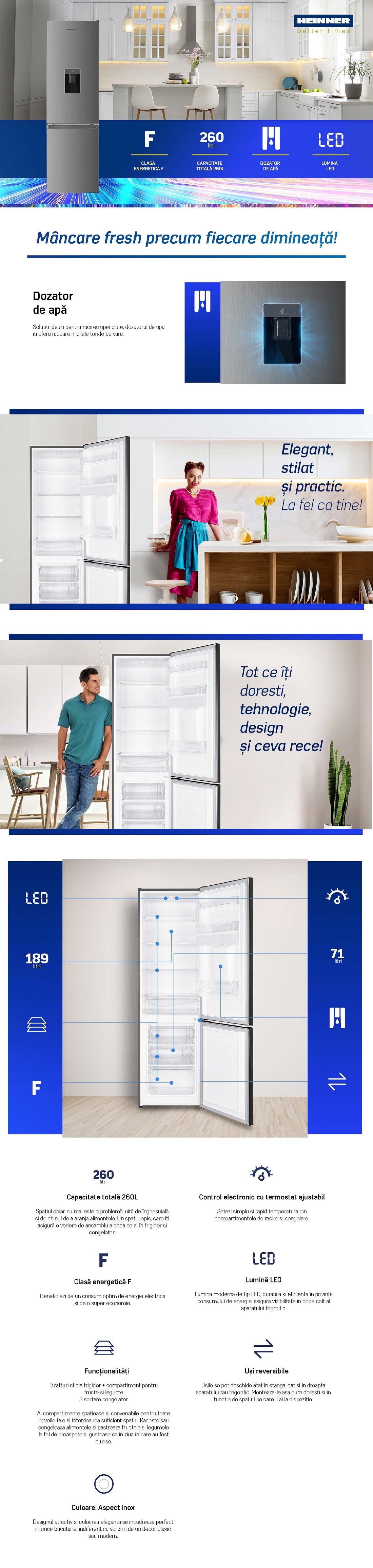 Combina frigorifica Heinner HC-HM260XWDF+, clasa energetica: F, capacitate totala: 260L, capacitate frigider: 189L, capacitate congelator: 71L, control electronic cu termostat ajustabil, dozator de apa, lumina LED, 3 rafturi sticla frigider, compartiment pentru fructe si legume, 3 sertare congelator, usi reversibile, suport oua, tavita cuburi de gheata, capacitate congelare: 3.2kg/24h, dimensiuni (WxDxH): 55 x 56 x 180 cm, culoare: Aspect inox