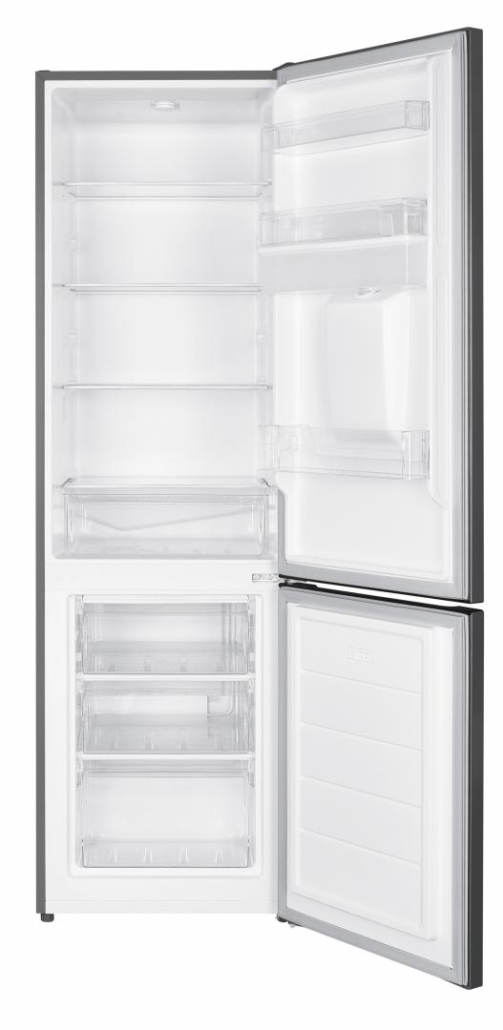 Combina frigorifica Heinner HC-HM260XWDF+, clasa energetica: F, capacitate totala: 260L, capacitate frigider: 189L, capacitate congelator: 71L, control electronic cu termostat ajustabil, dozator de apa, lumina LED, 3 rafturi sticla frigider, compartiment pentru fructe si legume, 3 sertare congelator, usi reversibile, suport oua, tavita cuburi de gheata, capacitate congelare: 3.2kg/24h, dimensiuni (WxDxH): 55 x 56 x 180 cm, culoare: Aspect inox