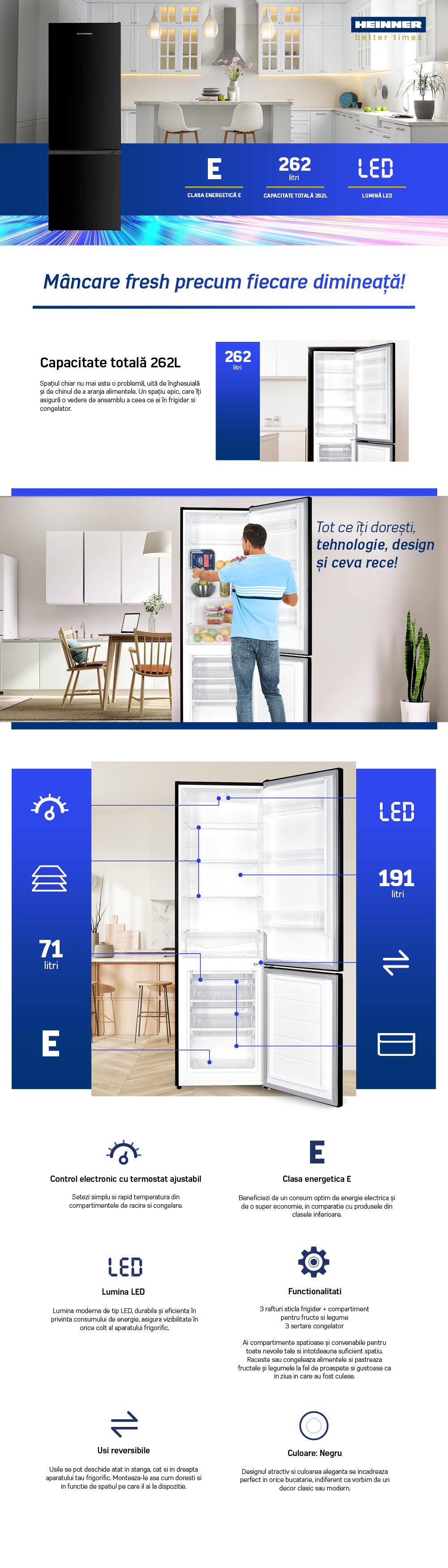 Combina frigorifica Heinner HC-HM262BKE++, clasa energetica: E, capacitate totala: 262L, capacitate frigider: 191L, capacitate congelator: 71L, control electronic cu termostat ajustabil, lumina LED, 3 rafturi sticla frigider, compartiment pentru fructe si legume, 3 sertare congelator, usi reversibile, suport oua, tavita cuburi de gheata, capacitate congelare: 3.2kg/24h, dimensiuni (WxDxH): 55 x 56 x 180 cm, culoare: Negru