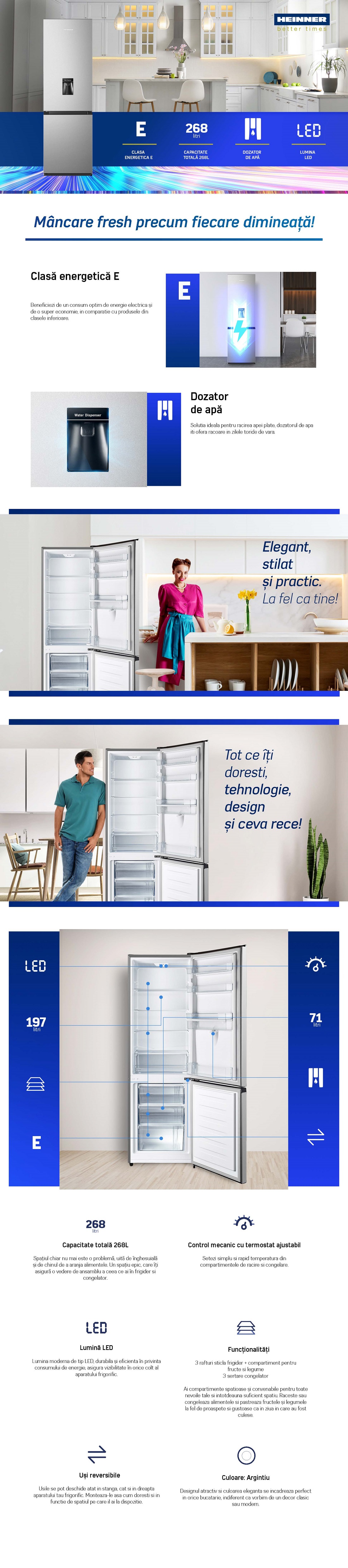 Combina frigorifica Heinner HC-HS268SWDE++, clasa energetica: E, capacitate totala: 268L, capacitate frigider: 197L, capacitate congelator: 71L, dozator de apa, control mecanic cu termostat ajustabil, lumina LED, 3 rafturi sticla frigider, compartiment pentru fructe si legume, 3 sertare congelator, usi reversibile, suport oua, tavita cuburi de gheata, capacitate congelare: 3.2kg/24h, dimensiuni (WxDxH): 55 x 55.8 x 180 cm, culoare: Argintiu