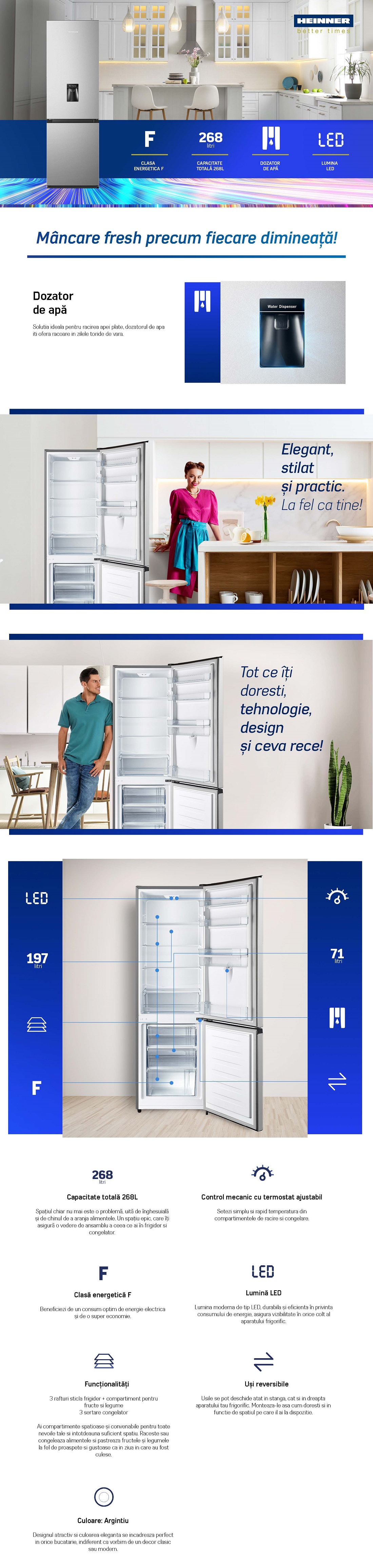 Combina frigorifica Heinner HC-HS268SWDF+, clasa energetica: F, capacitate totala: 268L, capacitate frigider: 197L, capacitate congelator: 71L, dozator de apa, control mecanic cu termostat ajustabil, lumina LED, 3 rafturi sticla frigider, compartiment pentru fructe si legume, 3 sertare congelator, usi reversibile, suport oua, tavita cuburi de gheata, capacitate congelare: 3.2kg/24h, dimensiuni (WxDxH): 55 x 55.8 x 180 cm, culoare: Argintiu