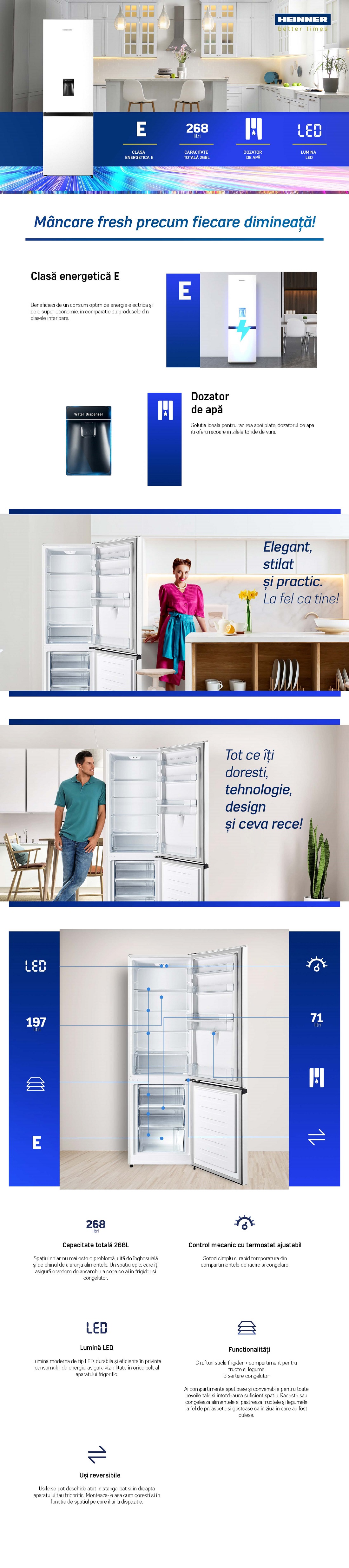 Combina frigorifica Heinner HC-HS268WDE++, clasa energetica: E, capacitate totala: 268L, capacitate frigider: 197L, capacitate congelator: 71L, dozator de apa, control mecanic cu termostat ajustabil, lumina LED, 3 rafturi sticla frigider, compartiment pentru fructe si legume, 3 sertare congelator, usi reversibile, suport oua, tavita cuburi de gheata, capacitate congelare: 3.2kg/24h, dimensiuni (WxDxH): 55 x 55.8 x 180 cm, culoare: Alb