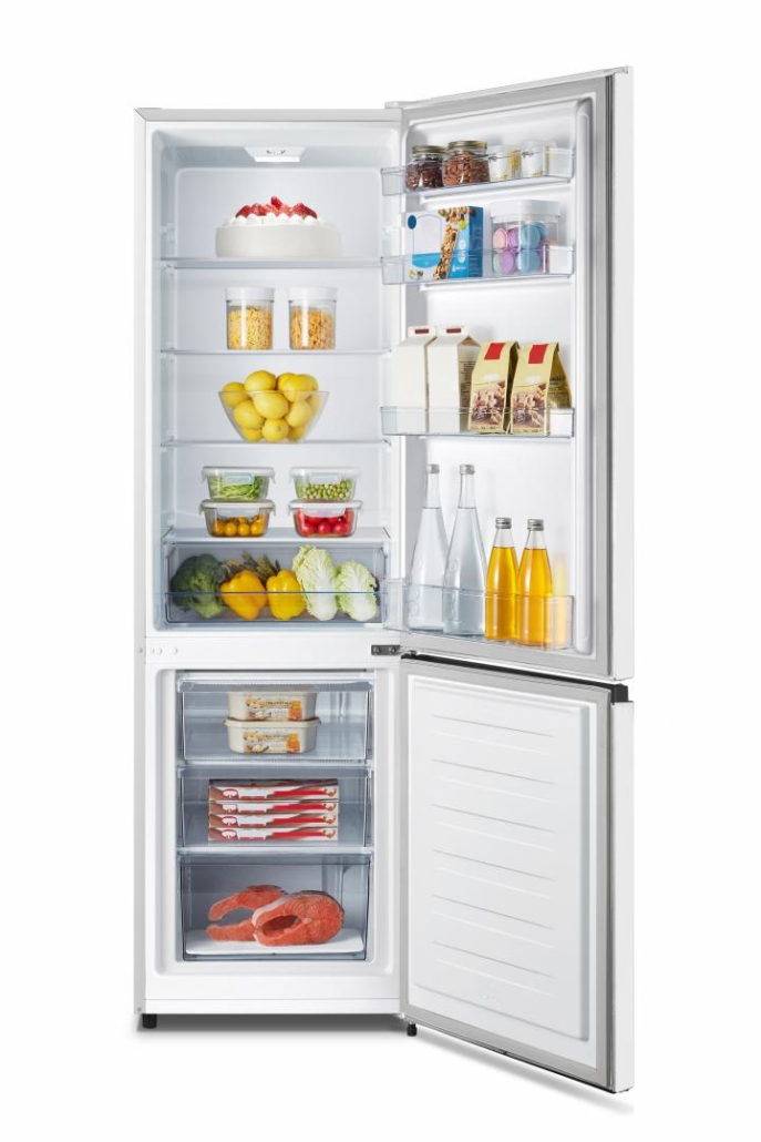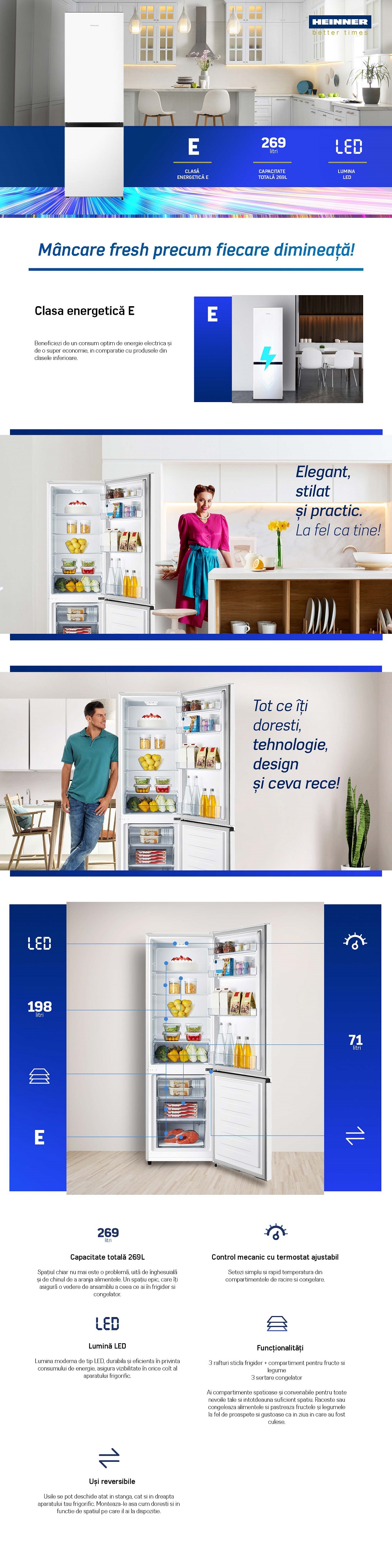 Combina frigorifica Heinner HC-HS269E++, clasa energetica: E, capacitate totala: 269L, capacitate frigider: 198L, capacitate congelator: 71L, control mecanic cu termostat ajustabil, lumina LED, 3 rafturi sticla frigider, compartiment pentru fructe si legume, 3 sertare congelator, usi reversibile, suport oua, tavita cuburi de gheata, capacitate congelare: 3.2kg/24h, dimensiuni (WxDxH): 55 x 55.8 x 180 cm, culoare: Alb