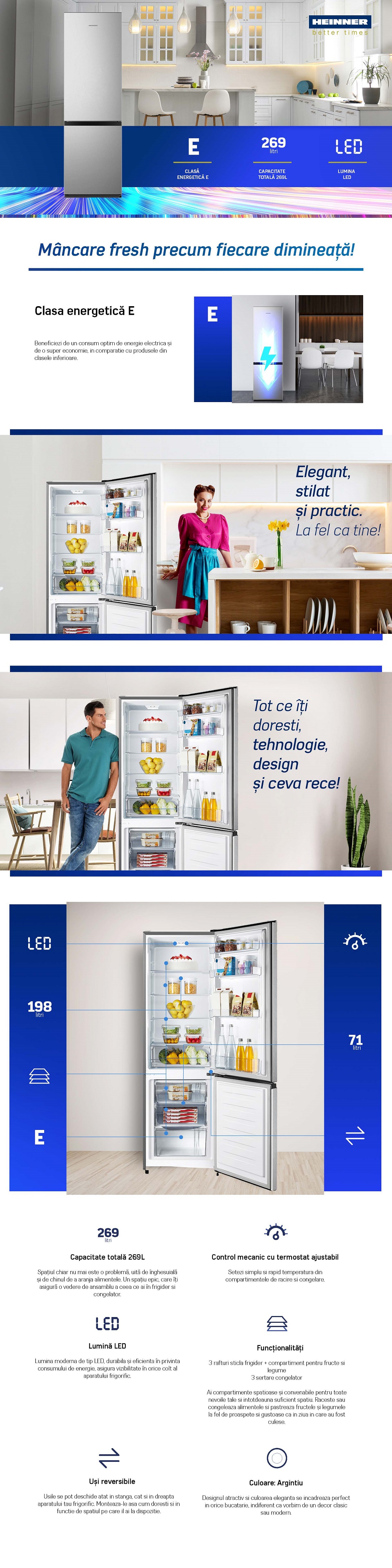Combina frigorifica Heinner HC-HS269SE++, clasa energetica: E, capacitate totala: 269L, capacitate frigider: 198L, capacitate congelator: 71L, control mecanic cu termostat ajustabil, lumina LED, 3 rafturi sticla frigider, compartiment pentru fructe si legume, 3 sertare congelator, usi reversibile, suport oua, tavita cuburi de gheata, capacitate congelare: 3.2kg/24h, dimensiuni (WxDxH): 55 x 55.8 x 180 cm, culoare: Argintiu