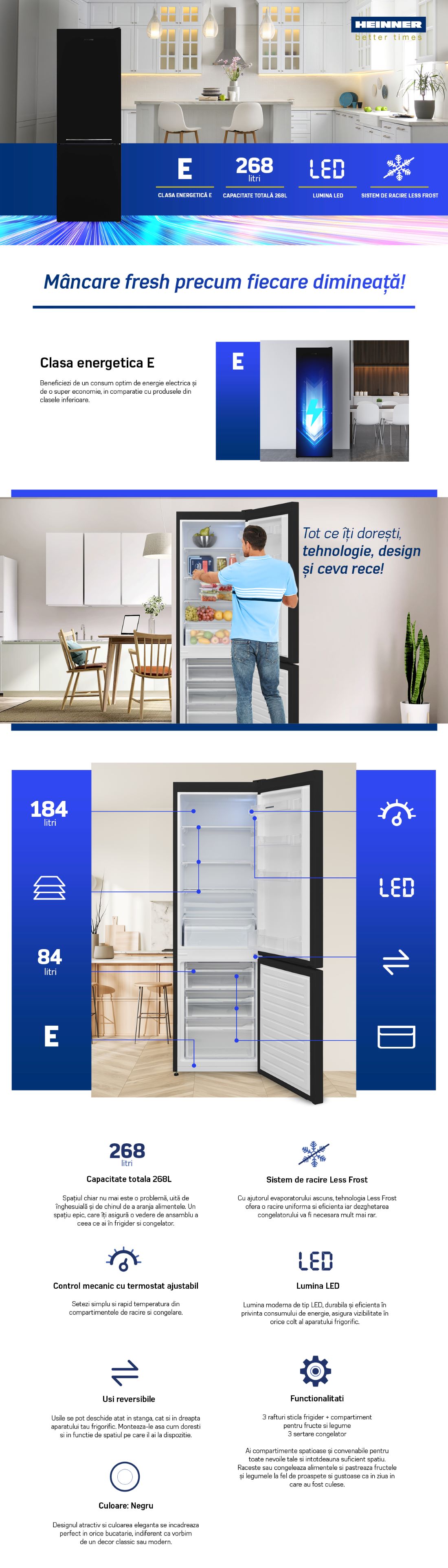 Combina frigorifica Heinner HC-V2681BKE++, clasa energetica: E, capacitate totala: 268L, capacitate frigider: 184L, capacitate congelator: 84L, control mecanic cu termostat ajustabil, lumina LED, 3 rafturi sticla frigider, 3 sertare congelator, compartiment pentru fructe si legume, usi reversibile, suport oua, tavita cuburi de gheata, capacitate congelare: 3.9kg/24h, dimensiuni: 54 x 59.5 x 170 cm, culaore: Negru cu decoratiune cromata pe maner