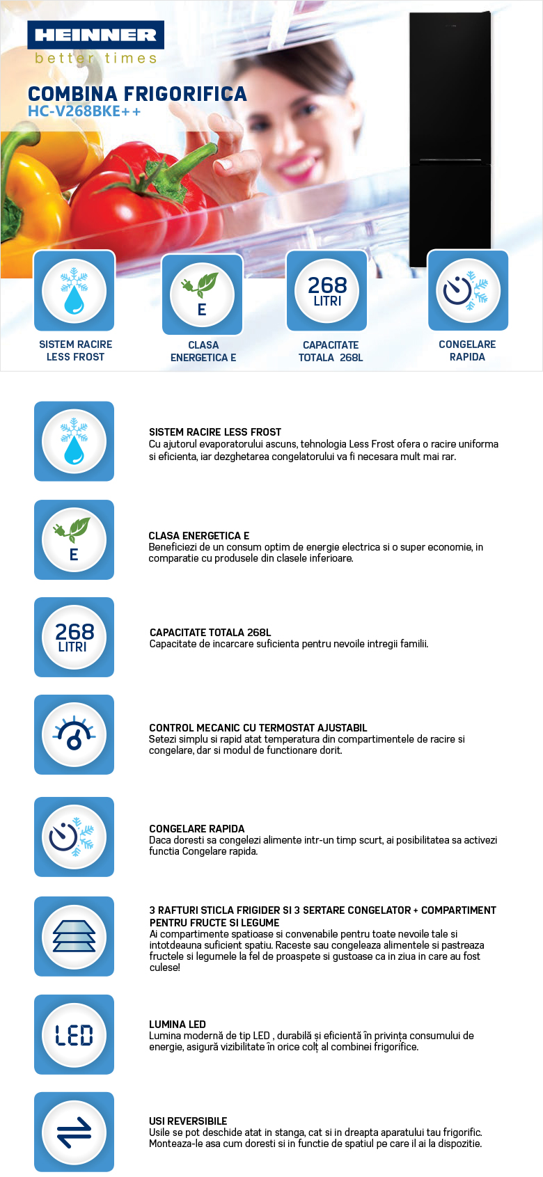 Combina frigorifica Heinner HC-V268BKE++, Clasa energetica: E, Sistem de racire Less Frost, Capacitate totala: 268L, Capacitate frigider: 184L, Capacitate congelator: 84L, Control mecanic cu termostat ajustabil, Lumina LED, Functie “Super congelare”, 3 rafturi sticla frigider, 3 sertare congelator, Compartiment pentru fructe si legume, Usi reversibile, Suport oua, Tavita cuburi de gheata, Capacitate congelare: 3.9kg/24h, Dimensiuni (WxDxH): 54 x 59.5 x 170 cm, negru cu decoratiune cromata pe maner.
