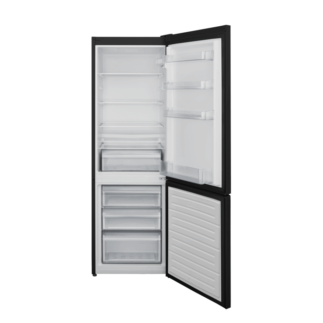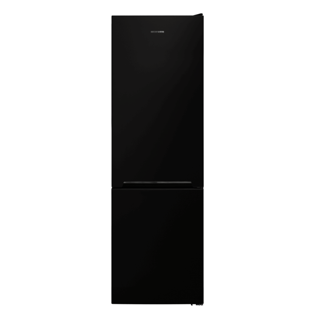 Combina frigorifica Heinner HC-V268BKE++, Clasa energetica: E, Sistem de racire Less Frost, Capacitate totala: 268L, Capacitate frigider: 184L, Capacitate congelator: 84L, Control mecanic cu termostat ajustabil, Lumina LED, Functie “Super congelare”, 3 rafturi sticla frigider, 3 sertare congelator, Compartiment pentru fructe si legume, Usi reversibile, Suport oua, Tavita cuburi de gheata, Capacitate congelare: 3.9kg/24h, Dimensiuni (WxDxH): 54 x 59.5 x 170 cm, negru cu decoratiune cromata pe maner.