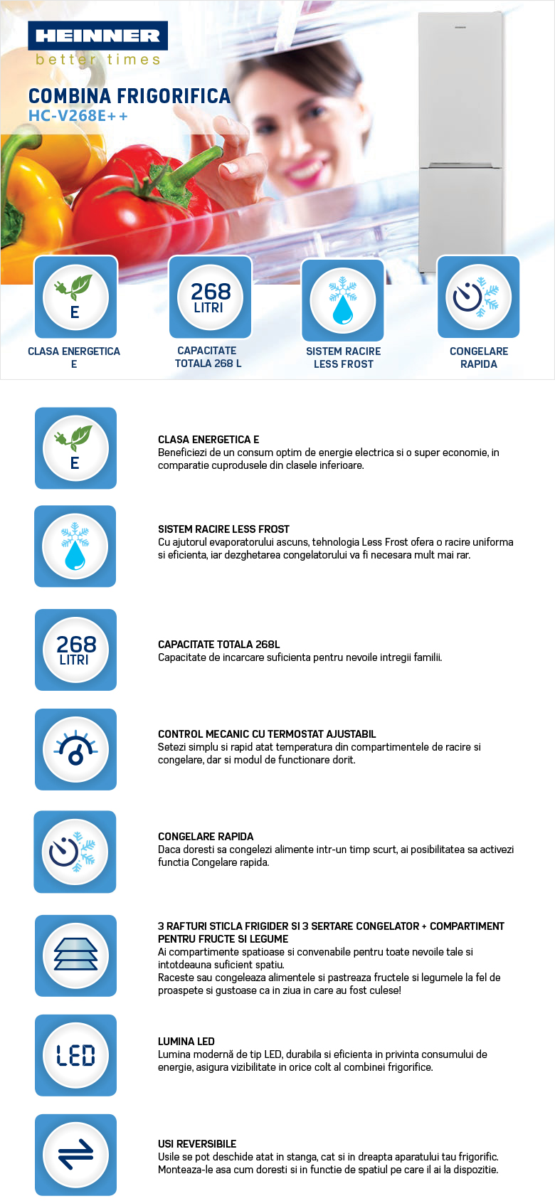 Combina frigorifica Heinner HC-V268E++, Clasa energetica: E, Sistem de racire Less Frost, Capacitate totala: 268L, Capacitate frigider: 184L, Capacitate congelator: 84L, Control mecanic cu termostat ajustabil, Lumina LED, Functie "Super congelare", 3 rafturi sticla frigider, 3 sertare congelator, Compartiment pentru fructe si legume, Usi reversibile, Suport oua, Tavita cuburi de gheata, Capacitate congelare: 3.9kg/24h, Dimensiuni (WxDxH): 54 x 59.5 x 170 cm, Alb cu decoratiune cromata pe maner.