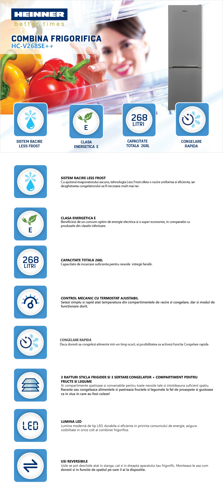 Combina frigorifica Heinner HC-V268SE++, Clasa energetica: E, Sistem de racire Less Frost, Capacitate totala: 268L, Capacitate frigider: 184L, Capacitate congelator: 84L, Control mecanic cu termostat ajustabil, Lumina LED, Functie “Super congelare”, 3 rafturi sticla frigider, 3 sertare congelator, Compartiment pentru fructe si legume, Usi reversibile, Suport oua, Tavita cuburi de gheata, Capacitate congelare: 3.9kg/24h, Dimensiuni (WxDxH): 54 x 59.5 x 170 cm, argintiu cu decoratiune cromata pe maner.
