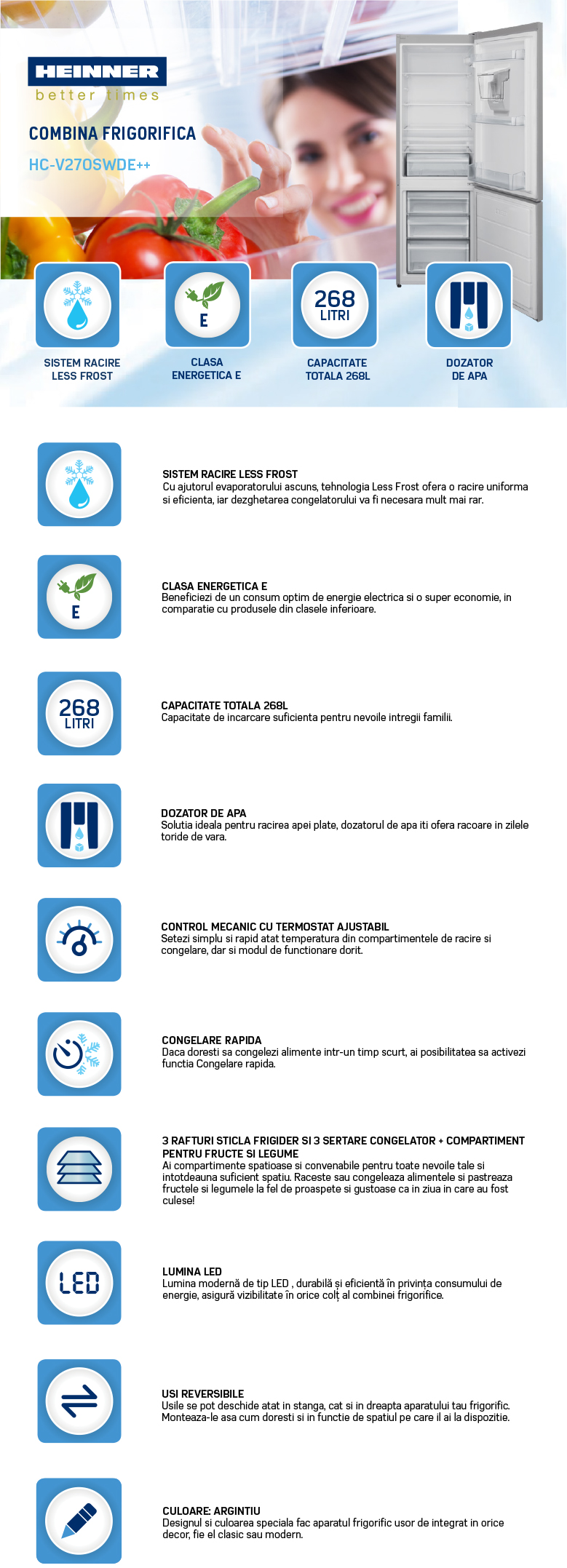 Combina frigorifica Heinner HC-V270SWDE++, clasa energetica: E, Sistem de racire Less Frost, capacitate totala: 268L, capacitate frigider: 184, capacitate congelator: 84L, control mecanic cu termostat ajustabil, lumina LED, functie "Super congelare", 3 rafturi sticla frigider, 3 sertare congelator, compartiment pentru fructe si legume, dozator de apa, dimensiuni (WxDxH): 54 x 59.5 x 170 cm, argintiu.