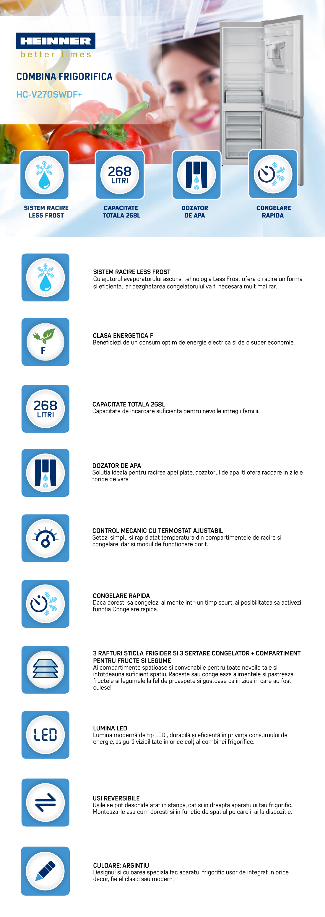 Combina frigorifica Heinner HC-V270SWDF+, clasa energetica: F, Sistem de racire Less frost, capacitate totala: 268L, capacitate frigider: 184, capacitate congelator: 84L, control mecanic cu termostat ajustabil, lumina LED, functie "Super congelare", 3 rafturi sticla frigider, 3 sertare congelator, compartiment pentru fructe si legume, dozator de apa, dimensiuni (WxDxH): 54 x 59.5 x 170 cm, argintiu