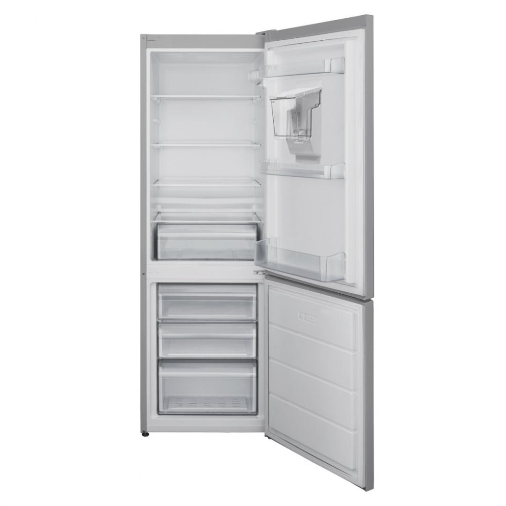 Combina frigorifica Heinner HC-V270SWDF+, clasa energetica: F, Sistem de racire Less frost, capacitate totala: 268L, capacitate frigider: 184, capacitate congelator: 84L, control mecanic cu termostat ajustabil, lumina LED, functie "Super congelare", 3 rafturi sticla frigider, 3 sertare congelator, compartiment pentru fructe si legume, dozator de apa, dimensiuni (WxDxH): 54 x 59.5 x 170 cm, argintiu