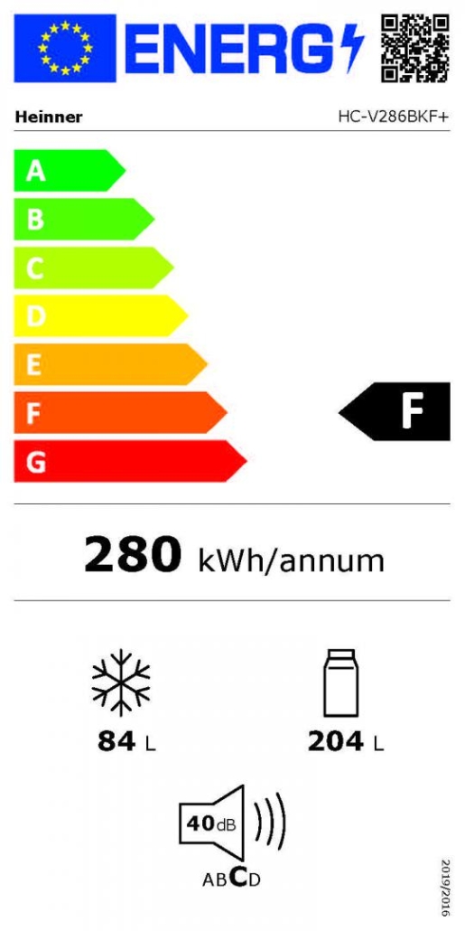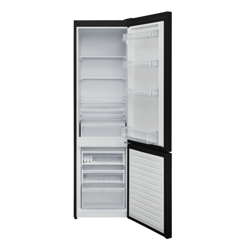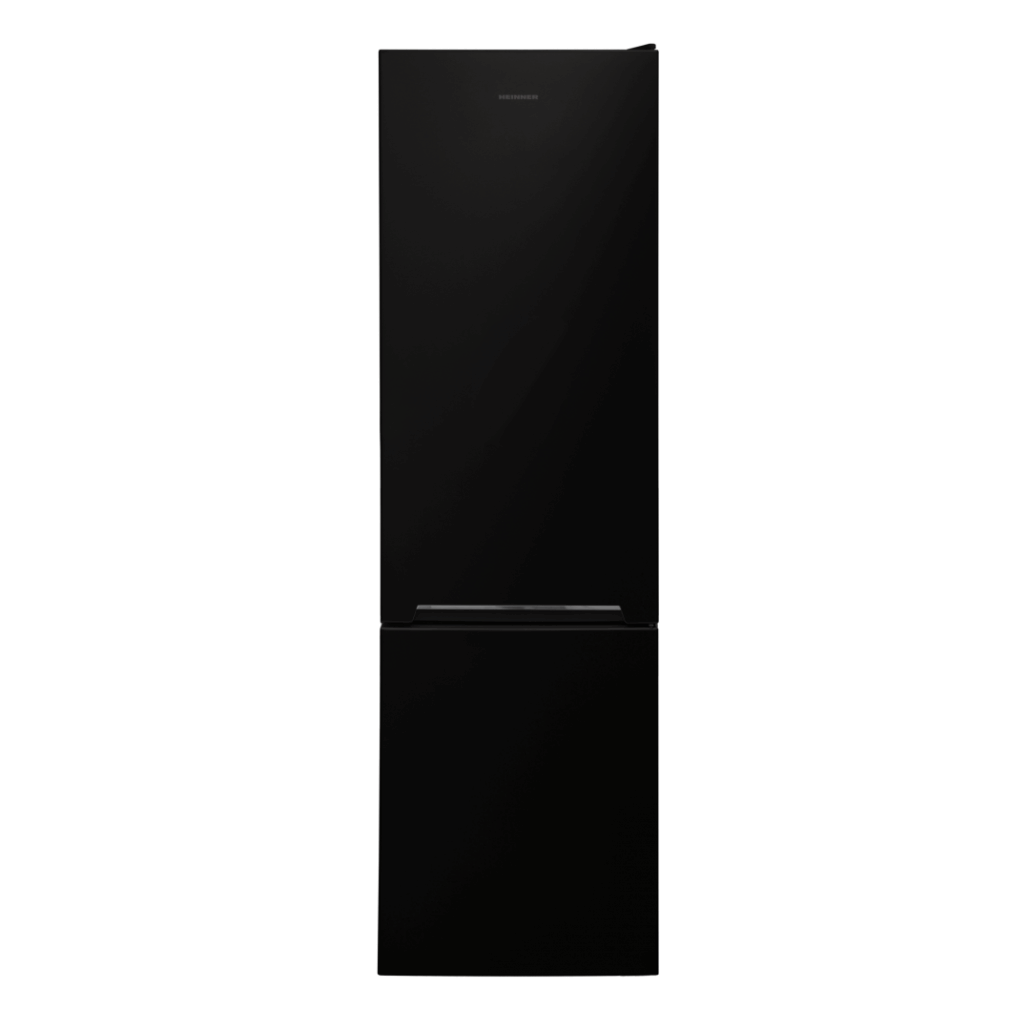 Combina frigorifica Heinner HC-V286BKF+, Clasa energetica: F, Sistem racire Less Frost, Capacitate totala: 288L, Capacitate frigider: 204L, Capacitate congelator: 84L, Control mecanic cu termostat ajustabil, Lumina LED, Functie “Super congelare”, 3 rafturi sticla frigider, Compartiment pentru fructe si legume, 3 sertare congelator, Usi reversibile, Suport oua, Tavita cuburi de gheata, Capacitate congelare: 3.9kg/24h, Dimensiuni (WxDxH): 54 x 59.5 x 180 cm, negru cu decoratiune cromata pe maner
