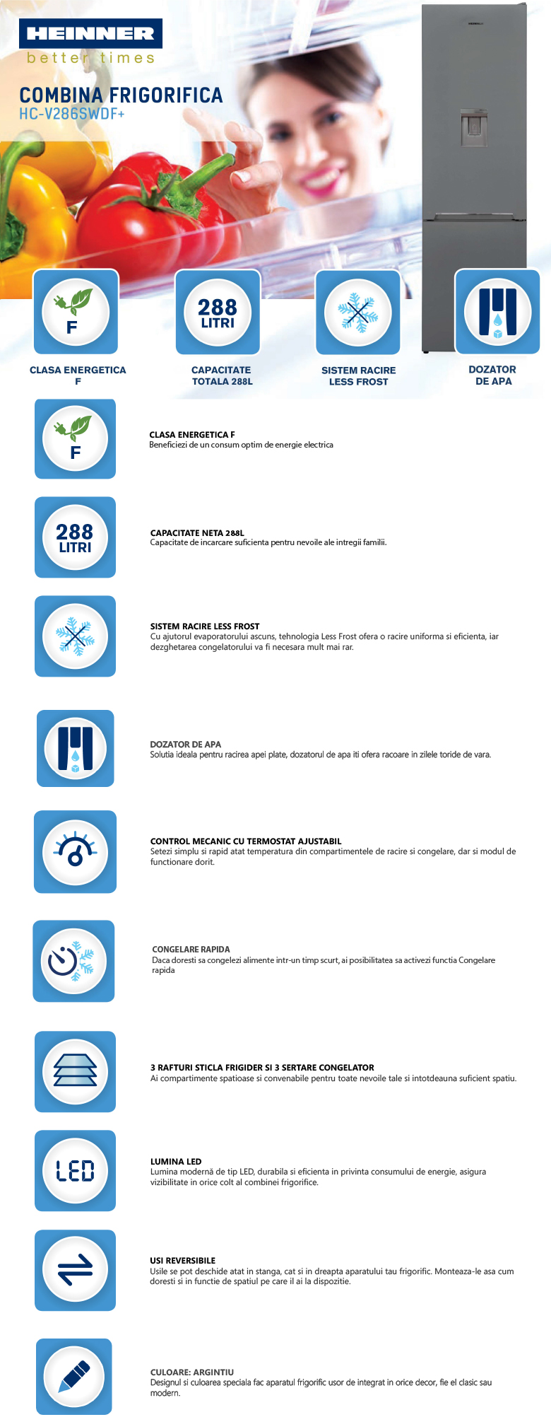 Combina frigorifica Heinner HC-V286SWDF+, Clasa energetica: F, Sistem racire Less Frost, Dozator de apa, Capacitate totala: 288L, Capacitate frigider: 204L, Capacitate congelator: 84L, Control mecanic cu termostat ajustabil, Lumina LED, Functie "Super congelare", 3 rafturi sticla frigider, Compartiment pentru fructe si legume, 3 sertare congelator, Usi reversibile, Suport oua, Tavita cuburi de gheata, Capacitate congelare: 3.9kg/24h, Dimensiuni (WxDxH): 54 x 59.5 x 180 cm, Culoare: Argintiu cu decoratiune cromata pe maner
