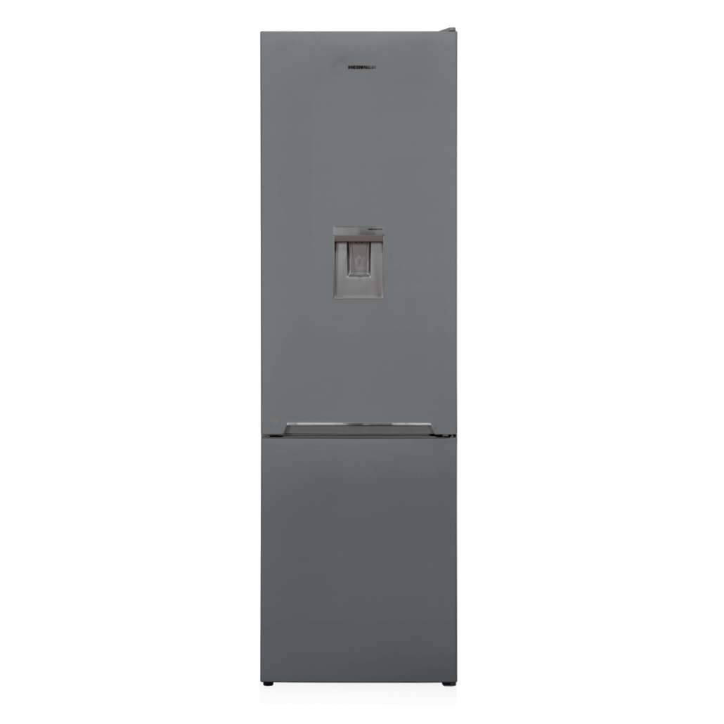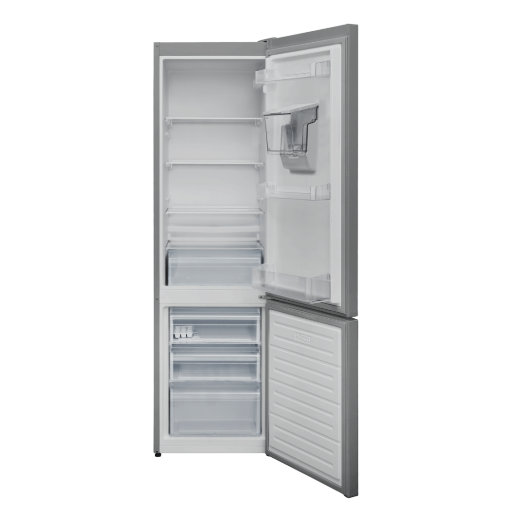 Combina frigorifica Heinner HC-V286SWDF+, Clasa energetica: F, Sistem racire Less Frost, Dozator de apa, Capacitate totala: 288L, Capacitate frigider: 204L, Capacitate congelator: 84L, Control mecanic cu termostat ajustabil, Lumina LED, Functie "Super congelare", 3 rafturi sticla frigider, Compartiment pentru fructe si legume, 3 sertare congelator, Usi reversibile, Suport oua, Tavita cuburi de gheata, Capacitate congelare: 3.9kg/24h, Dimensiuni (WxDxH): 54 x 59.5 x 180 cm, Culoare: Argintiu cu decoratiune cromata pe maner