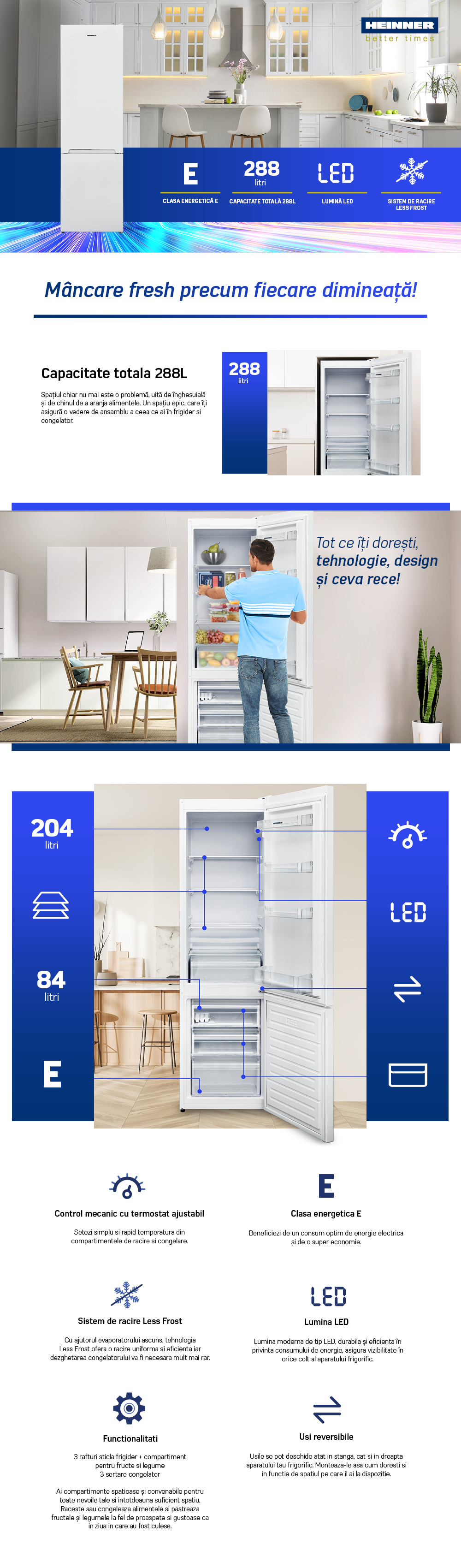 Combina frigorifica Heinner HC-V288E++, clasa energetica: E, sistem de racire Less Frost, capacitate totala: 288L, capacitate frigider: 204L, capacitate congelator: 84L., control mecanic cu termostat ajustabil, functie Super congelare, lumina LED, 3 rafturi sticla frigider, compartiment pentru fructe si legume, 3 sertare congelator, usi reversibile, suport oua, tavita cuburi de gheata, capacitate congelare: 3.9kg/24h, dimensiuni (WxDxH): 54 x 59.5 x 180 cm, maner cu decoratiune cromata, culoare: Alb