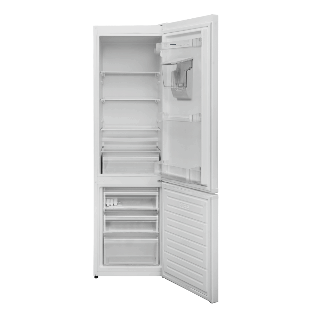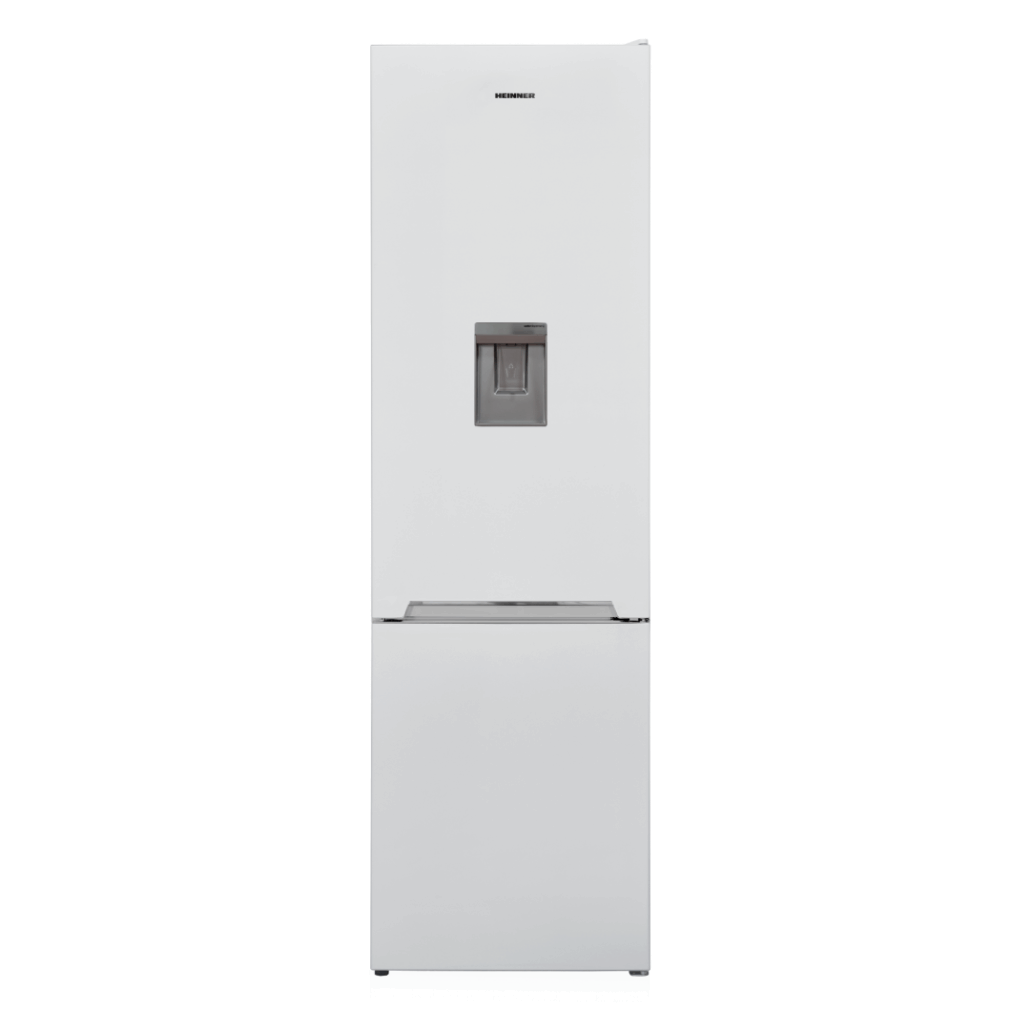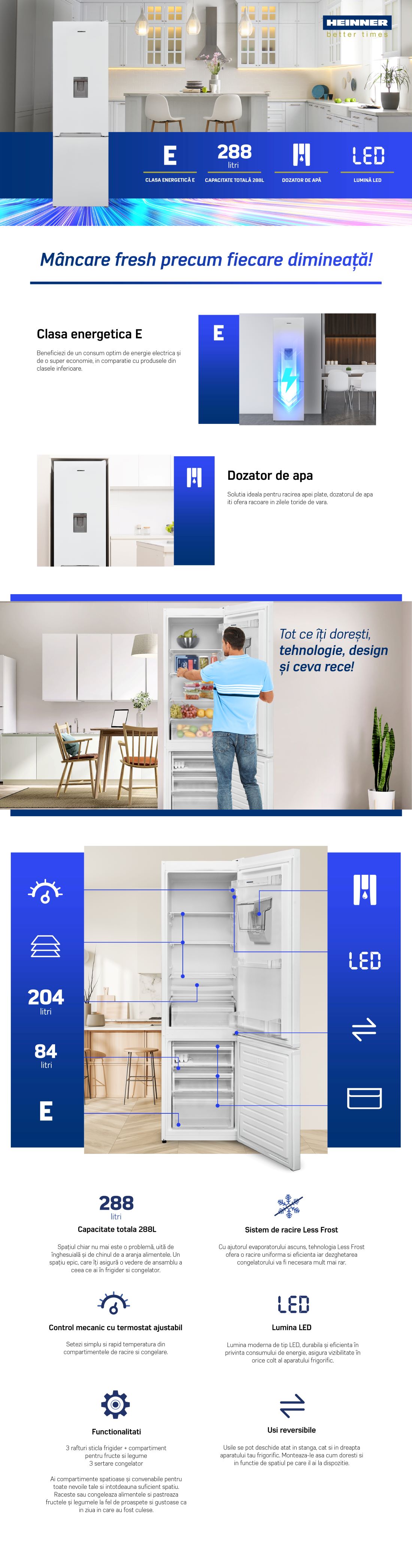 Combina frigorifica Heinner HC-V288WDE++, clasa energetica: E, sistem racire Less Frost, dozator de apa, capacitate totala: 288L, capacitate frigider: 204L, capacitate congelator: 84L, control mecanic cu termostat ajustabil, lumina LED, 3 rafturi sticla frigider, compartiment pentru fructe si legume, 3 sertare congelator, usi reversibile, suport oua, tavita cuburi de gheata, capacitate congelare: 3.9kg/24h, dimensiuni: 54 x 59.5 x 180 cm, culoare: Alb cu decoratiune cromata pe maner
