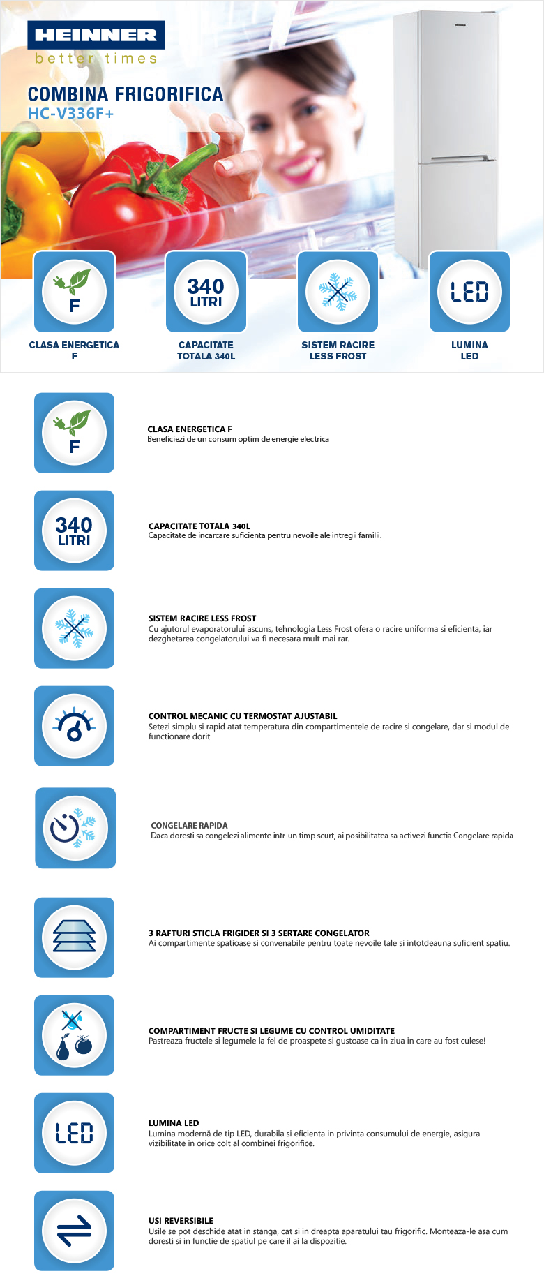 Combina frigorifica Heinner HC-V336F+, clasa energetica: F, sistem racire Less Frost, capacitate totala: 340L, capacitate frigider: 233L, capacitate congelator: 107L, control mecanic cu termostat ajustabil, lumina LED, functie "Super congelare", 3 rafturi sticla frigider, compartiment pentru fructe si legume cu control umiditate, 3 sertare congelator, usi reversibile, suport oua, tavita cuburi gheata, capacitate congelare: 5.2kg/24h, dimensiuni (WxDxH): 59.5 x 65 x 186 cm, aspect Inox cu decoratiune cromata pe maner