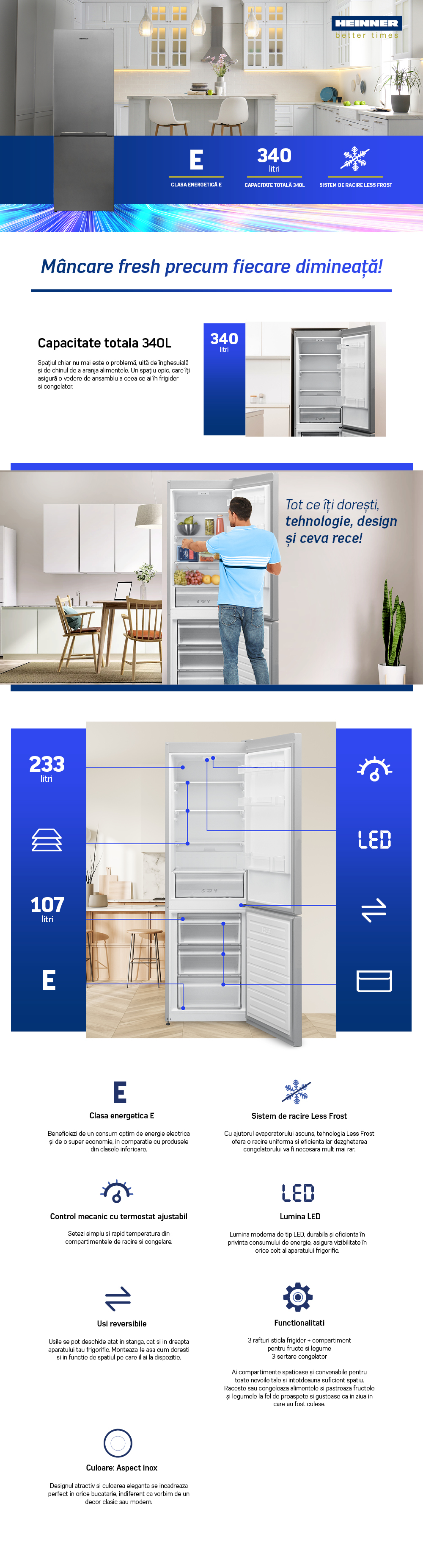 Combina frigorifica Heinner HC-V341XE++, clasa energetica: E, sistem de racire Less Frost, capacitate totala: 340L, capacitate frigider: 233L, capacitate congelator: 107L, control mecanic cu termostat ajustabil, lumina LED, functie “Super congelare”, 3 rafturi sticla frigider, compartiment pentru fructe si legume cu control umiditate, 3 sertare congelator, usi reversibile, suport oua, tavita cuburi gheata, capacitate congelare: 5.2kg/24h, dimensiuni (WxDxH): 59.5 x 65 x 186 cm, aspect inox cu decoratiune cromata pe maner