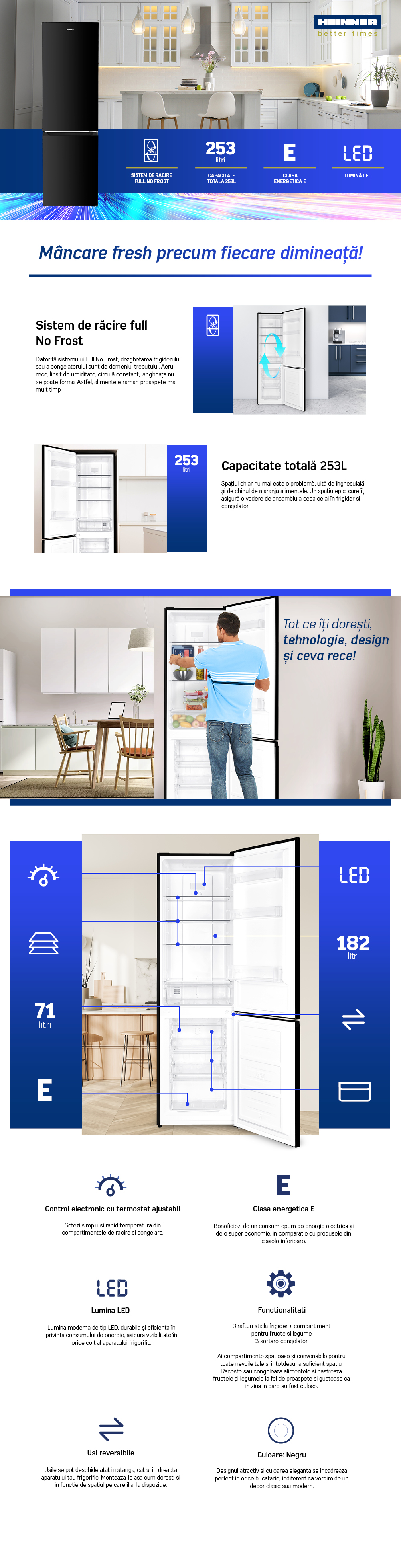 Combina frigorifica Heinner HCNF-HM253BKE++, No Frost, clasa energetica E, capacitate totala: 253L, capacitate frigider: 182L, capacitate congelator: 71L, control electronic cu termostat ajustabil, lumina LED, 3 rafturi din sticla frigider, compartiment pentru fructe si legume, 3 sertare congelator, suport oua, tavita cuburi gheata, capacitate de congelare: 3.2kg/24h, dimensiuni (WxDxH): 54 x 60 x 180 cm, culoare: Negru