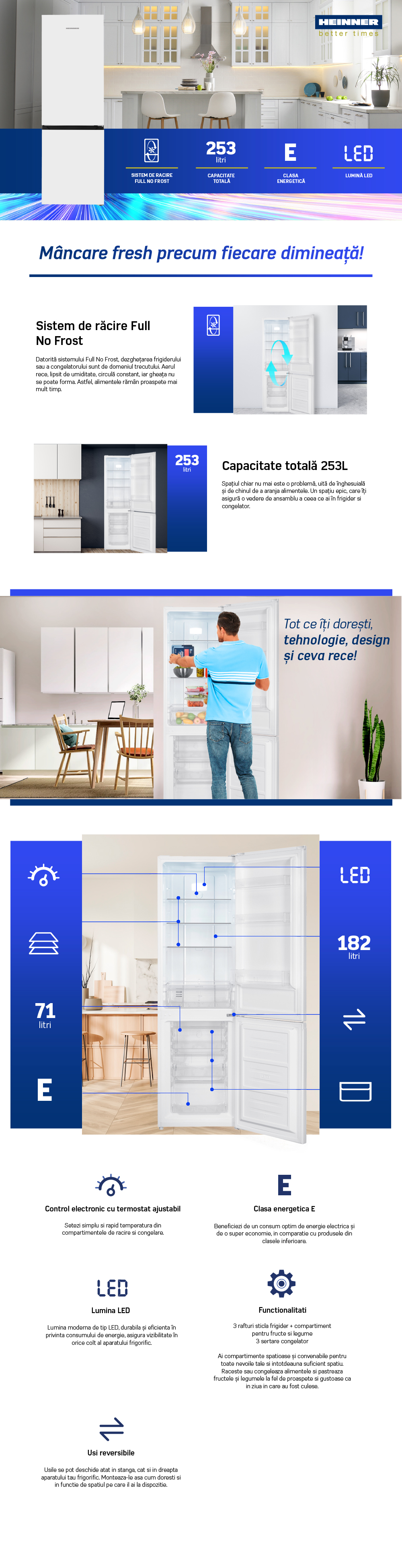 Combina frigorifica Heinner HCNF-HM253E++, No Frost, clasa energetica E, capacitate totala: 253 L, capacitate frigider: 182 L, capacitate congelator: 71 L, control electronic cu termostat ajustabil, lumina LED, 3 rafturi din sticla frigider, compartiment pentru fructe si legume, 3 sertare congelator, usi reversibile, suport oua, tavita cuburi gheata, capacitate de congelare: 3.2kg/24h, dimensiuni (LxAxI): 54 x 60 x 180cm, culoare: Alb