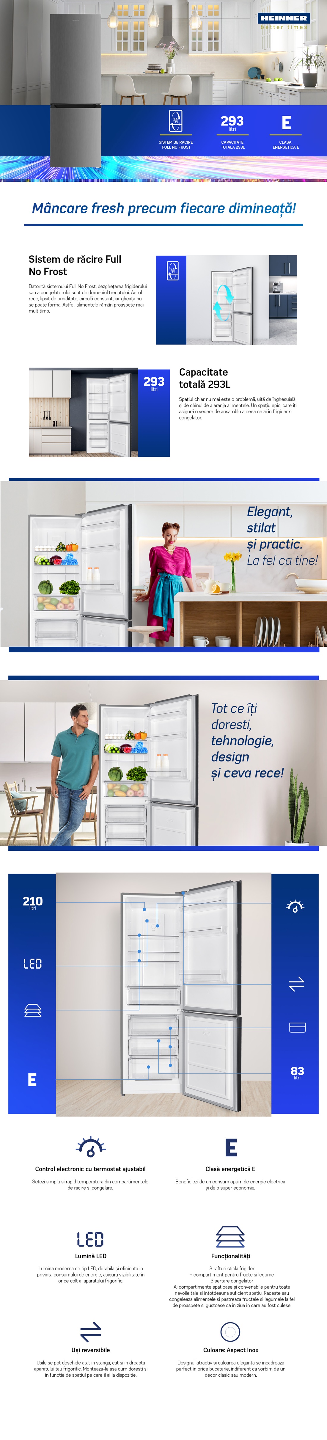 Combina frigorifica Heinner HCNF-HM293XE++, No Frost, clasa energetica: E, capacitate totala: 293L, capacitate frigider: 210L, capacitate congelator: 83L, control electronic cu termostat ajustabil, lumina LED, 3 rafturi din sticla frigider, compartiment pentru fructe si legume, 3 sertare congelator, suport oua, tavita cuburi gheata, capacitate de congelare: 3.8kg/24h, dimensiuni (WxDxH): 60 x 60 x 186 cm, culoare: Apect inox cu maner negru
