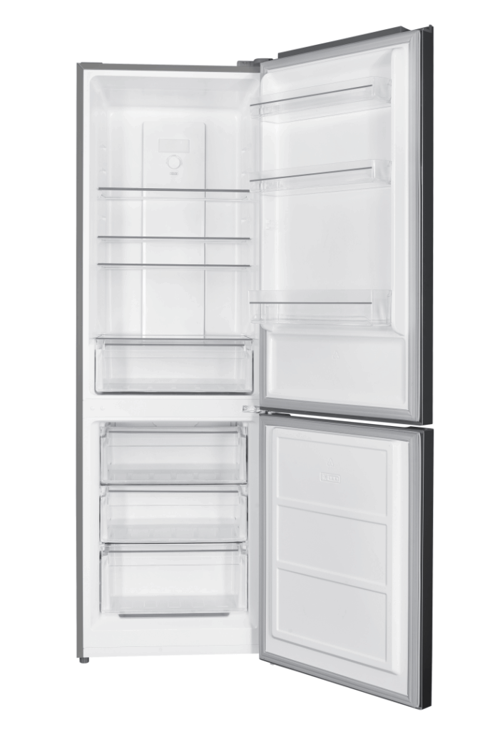 Combina frigorifica Heinner HCNF-HM293XE++, No Frost, clasa energetica: E, capacitate totala: 293L, capacitate frigider: 210L, capacitate congelator: 83L, control electronic cu termostat ajustabil, lumina LED, 3 rafturi din sticla frigider, compartiment pentru fructe si legume, 3 sertare congelator, suport oua, tavita cuburi gheata, capacitate de congelare: 3.8kg/24h, dimensiuni (WxDxH): 60 x 60 x 186 cm, culoare: Apect inox cu maner negru