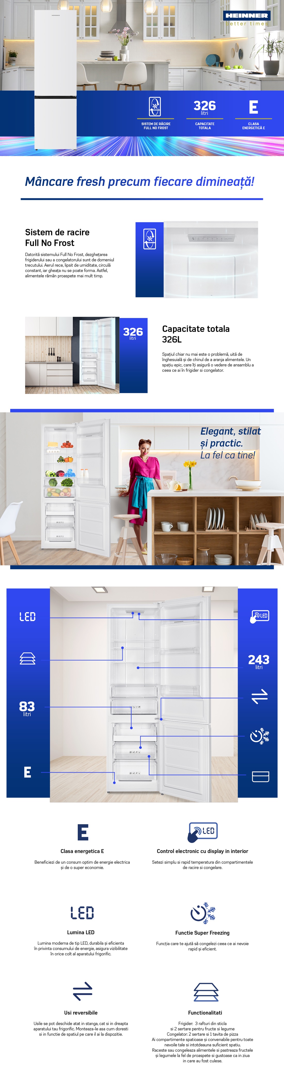 Combina frigorifica Heinner HCNF-HM326E++, Total No Frost, clasa energetica E, capacitate totala: 326 L, capacitate frigider: 243 L, capacitate congelator: 83 L, control electronic cu termostat ajustabil, lumina LED, functie Super congelare, 3 rafturi din sticla frigider, compartiment pentru fructe si legume, 3 compartimente congelator, suport oua, tavita cuburi gheata, capacitate de congelare: 3.8kg/24h, dimensiuni (WxDxH): 60 x 60 x 201 cm, culoare: Alb