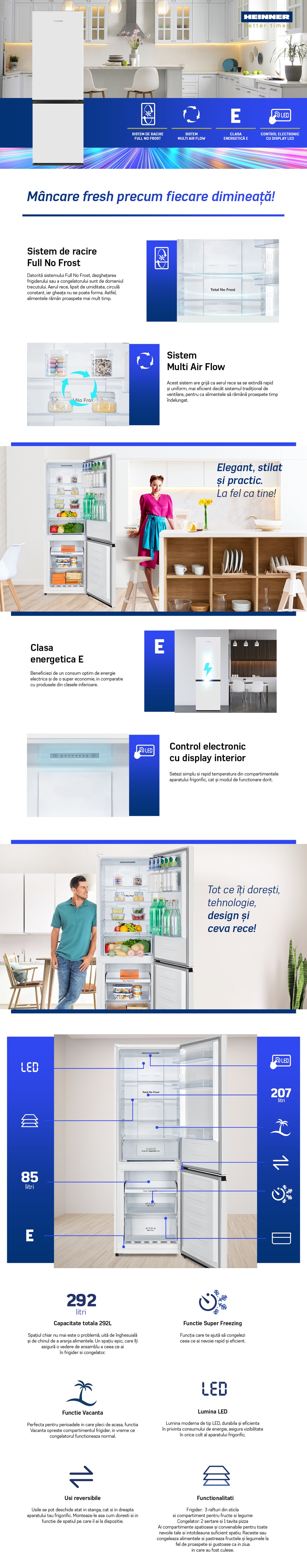 Combina frigorifica Heinner HCNF-HS292E++, Total No Frost, sistem Multi Air-Flow, clasa energetica E, capacitate totala: 292 L, capacitate frigider: 207 L, capacitate congelator: 85 L, control electronic cu display in interior, functie Vacanta, functie Super congelare, 3 rafturi din sticla frigider, compartiment pentru fructe si legume, 2 sertare + 1 Tavita pizza congelator, lumina LED, suport oua, tavita cuburi gheata, capacitate de congelare: 5kg/24h, dimensiuni (WxDxH): 59.5 x 59 x 178.5 cm, culoare: Alb cu maner negru