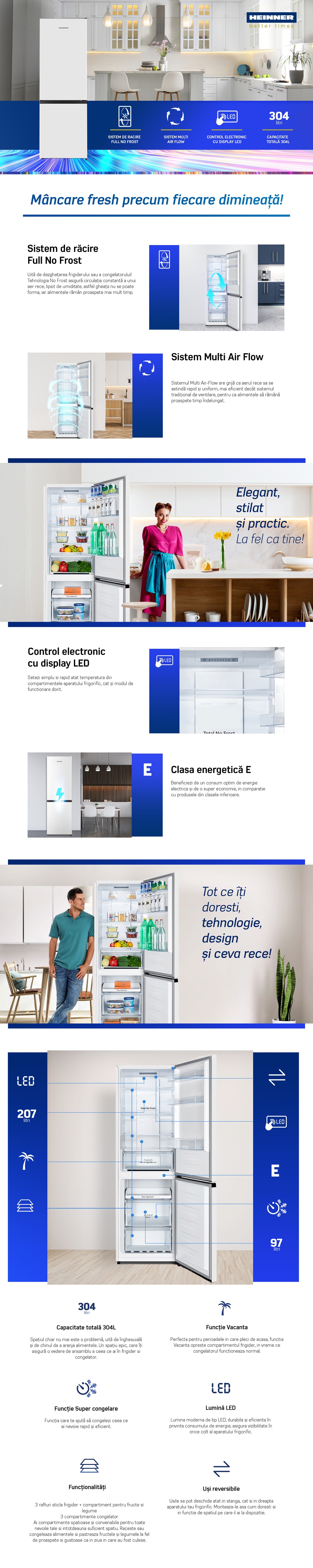 Combina frigorifica Heinner HCNF-HS304E++, Full No Frost, sistem Multi Air-Flow, clasa energetica E, capacitate totala: 304 L, capacitate frigider: 207 L, capacitate congelator: 97 L, control electronic cu display LED, functie Vacanta, functie Super congelare, lumina LED, 3 rafturi din sticla frigider, compartiment pentru fructe si legume, 3 compartimente congelator, capacitate de congelare: 6kg/24h, dimensiuni (WxDxH): 59.5 x 59 x 186 cm, culoare: Alb cu maner negru