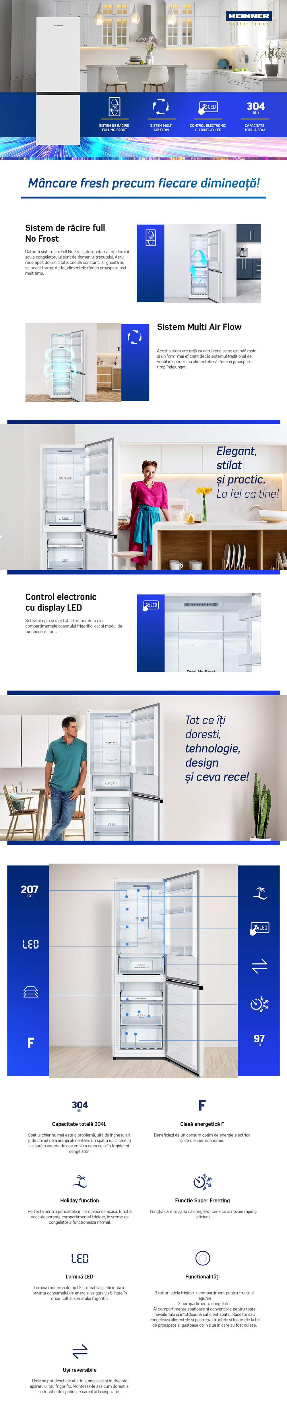 Combina frigorifica Heinner HCNF-HS304F+, No Frost, sistem Multi Air Flow, clasa energetica F, capacitate totala: 304L, capacitate frigider: 207L, capacitate congelator: 97L, control electronic cu display in interior, functie Vacanta, functie Congelare rapida, lumina LED, 3 rafturi din sticla frigider, compartiment fructe si legume, 2 sertare congelator + tavita pizza, suport oua, tavita cuburi de gheata, capacitate de congelare: 6 kg/24h, dimensiuni (WxDxH): 59.5 x 59 x 186 cm, culoare: Alb cu maner negru