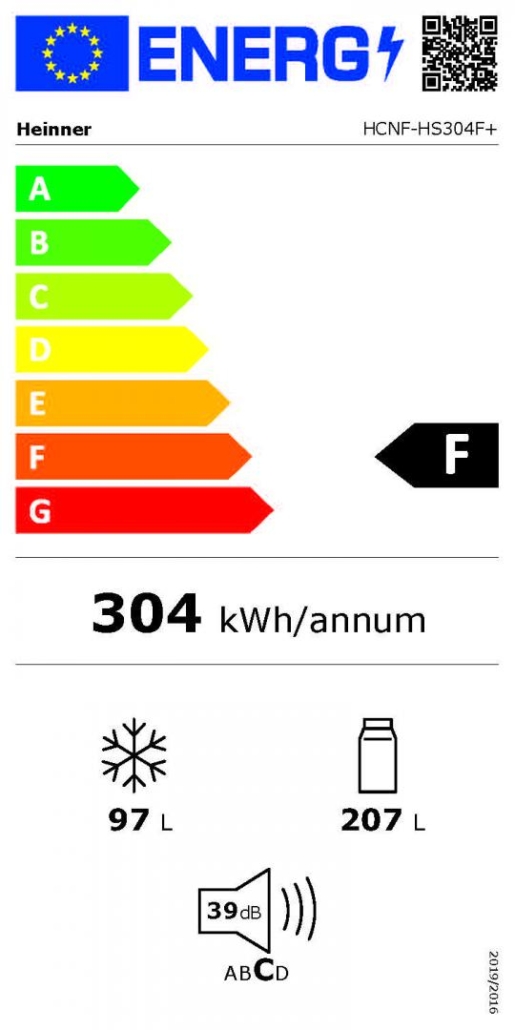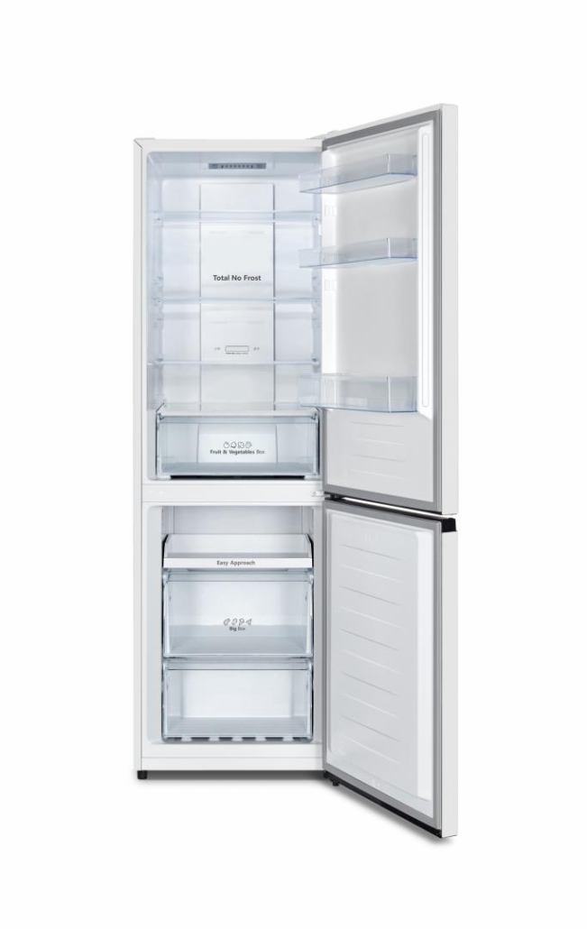 Combina frigorifica Heinner HCNF-HS304F+, No Frost, sistem Multi Air Flow, clasa energetica F, capacitate totala: 304L, capacitate frigider: 207L, capacitate congelator: 97L, control electronic cu display in interior, functie Vacanta, functie Congelare rapida, lumina LED, 3 rafturi din sticla frigider, compartiment fructe si legume, 2 sertare congelator + tavita pizza, suport oua, tavita cuburi de gheata, capacitate de congelare: 6 kg/24h, dimensiuni (WxDxH): 59.5 x 59 x 186 cm, culoare: Alb cu maner negru