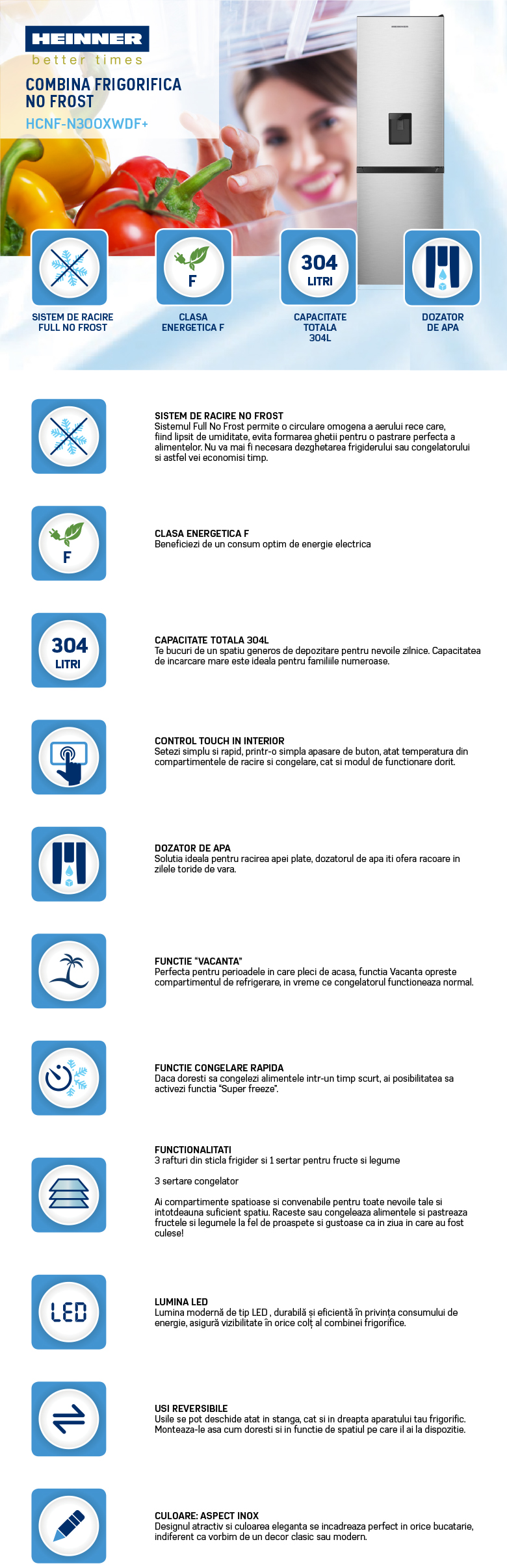 Combina frigorifica Heinner HCNF-N300XWDF+, Total No Frost, Dozator de apa, Clasa energetica F, Capacitate totala: 304 L, Capacitate frigider: 207 L, Capacitate congelator: 97 L, Control electronic cu display in interior, Lumina LED, Functie Vacanta, Functie congelare rapida, 3 rafturi din sticla frigider, Compartiment pentru fructe si legume, 3 sertare congelator, Capacitate de congelare: 6kg/24h, Dimensiuni (WxDxH): 59.5 x 59 x 186cm, Culoare: Aspect Inox