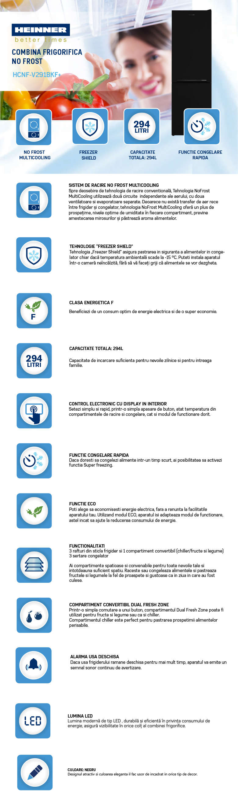 Combina frigorifica Heinner HCNF-V291BKF+, No Frost Multicooling, clasa energetica F, capacitate totala: 294 L, capacitate frigider: 207 L, capacitate congelator: 87 L, control electronic cu display in interior, tehnologie Freezer Shield, lumina LED, functie ECO, functie congelare rapida, alarma usa deschisa, 3 rafturi din sticla frigider, compartiment convertibil (chiller/fructe si legume), 3 sertare congelator, suport oua, tavita cuburi gheata, capacitate de congelare: 5kg/24h, dimensiuni (WxDxH): 59.5 x 60 x 186cm, culoare: negru cu decoratiune cromata pe maner