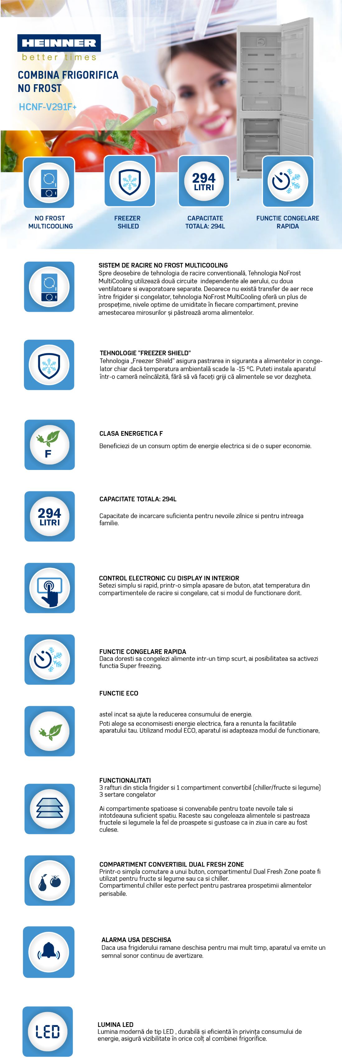 Combina frigorifica Heinner HCNF-V291F+, No Frost Multicooling, clasa energetica F, capacitate totala: 294 L, capacitate frigider: 207 L, capacitate congelator: 87 L, control electronic cu display in interior, lumina LED, functie ECO, functie congelare rapida, alarma usa deschisa, tehnologie Freezer shield (opereaza la temperaturi scazute: -15°C), 3 rafturi din sticla frigider, compartiment convertibil (chiller/fructe si legume), 3 sertare congelator, suport oua, tavita cuburi gheata, capacitate de congelare: 5kg/24h, dimensiuni (WxDxH): 59.5 x 60 x 186cm, culoare: alb cu decoratiune cromata pe maner