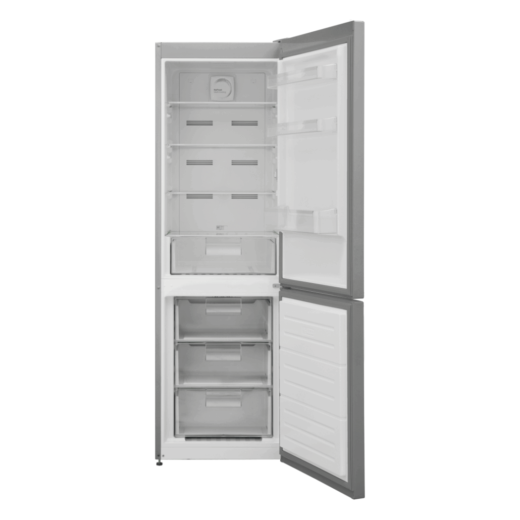 Combina frigorifica Heinner HCNF-V291SE++, No Frost Multicooling, clasa energetica E, capacitate totala: 294 L, capacitate frigider: 207 L, capacitate congelator: 87 L, control electronic cu display in interior, tehnologie Freezer Shield (Functioneaza la temperaturi de pana la -15⁰C), lumina LED, functie ECO, functie congelare rapida, alarma usa deschisa, 3 rafturi din sticla frigider, compartiment convertibil (chiller/fructe si legume), 3 sertare congelator, suport oua, tavita cuburi gheata, capacitate de congelare: 5kg/24h, dimensiuni (WxDxH): 59.5 x 60 x 186cm, culoare: argintiu cu decoratiune cromata pe maner