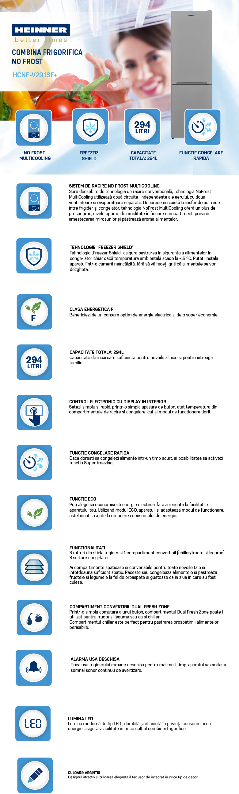 Combina frigorifica Heinner HCNF-V291SF+, No Frost Multicooling, clasa energetica F, capacitate totala: 294 L, capacitate frigider: 207 L, capacitate congelator: 87 L, control electronic cu display in interior, tehnologie Freezer Shield, lumina LED, functie ECO, functie congelare rapida, alarma usa deschisa, 3 rafturi din sticla frigider, compartiment convertibil (chiller/fructe si legume), 3 sertare congelator, suport oua, tavita cuburi gheata, capacitate de congelare: 5kg/24h, dimensiuni (WxDxH): 59.5 x 60 x 186cm, culoare: argintiu cu decoratiune cromata pe maner