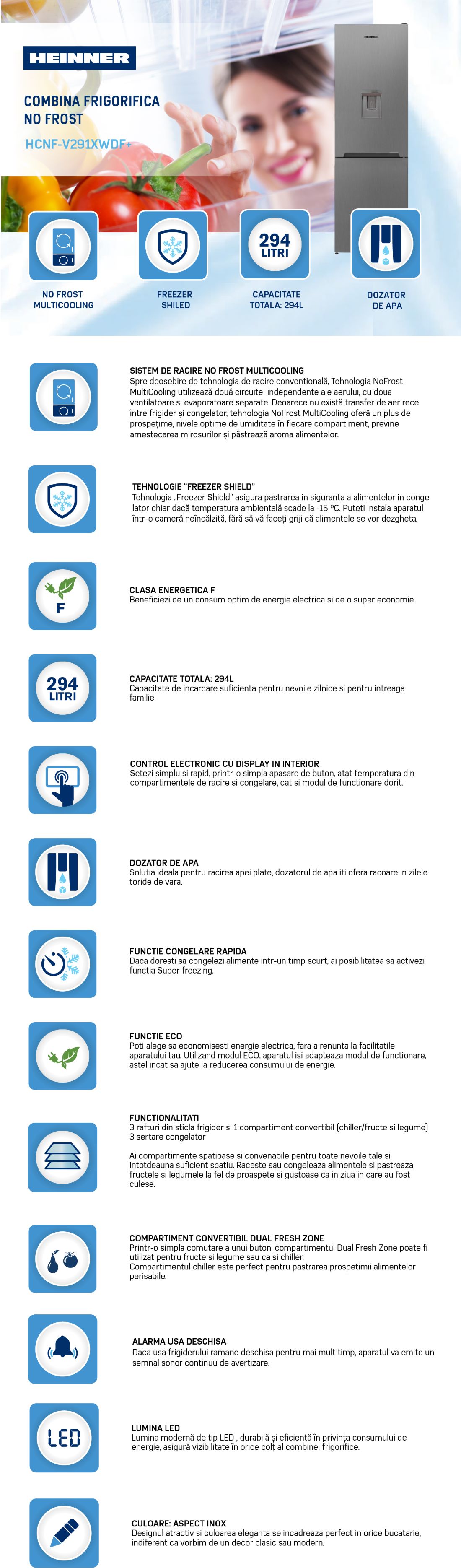 Combina frigorifica Heinner HCNF-V291XWDF+, No Frost Multicooling, Dozator de apa, Clasa energetica F, Capacitate totala: 294 L, Capacitate frigider: 207 L, Capacitate congelator: 87 L, Control electronic cu display in interior, Lumina LED, Functie ECO, Functie congelare rapida, Tehnologie Freezer shield (Rezistenta la frig), alarma usa deschisa, 3 rafturi din sticla frigider, Compartiment convertibil (chiller/fructe si legume), 3 sertare congelator, Suport oua, Tavita cuburi gheata, Capacitate de congelare: 5kg/24h, Dimensiuni (WxDxH): 59.5 x 60 x 186cm, Culoare: Aspect inox cu decoratiune cromata pe maner