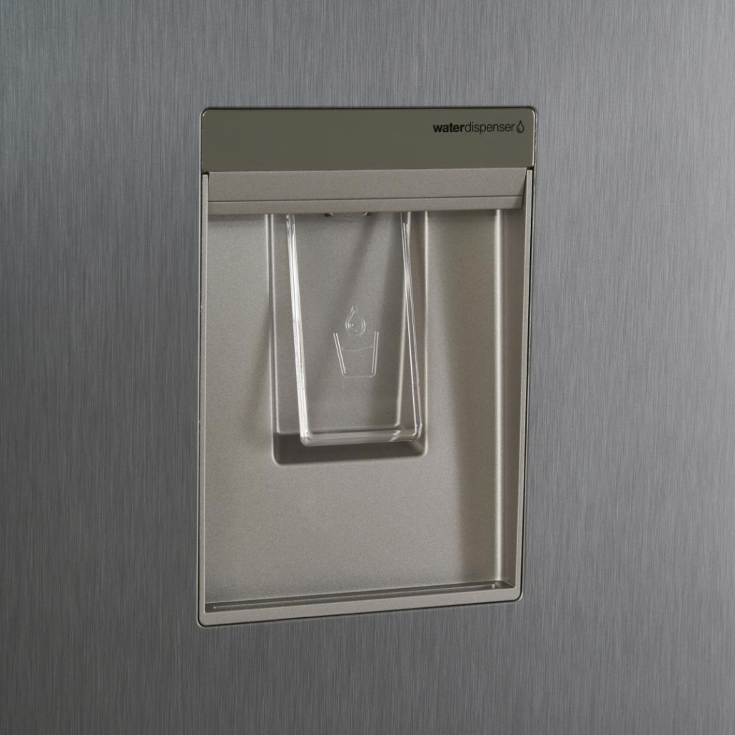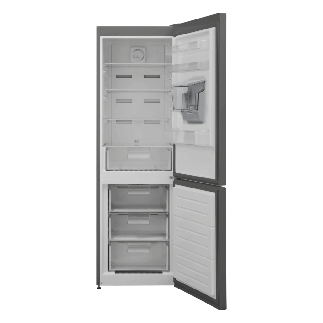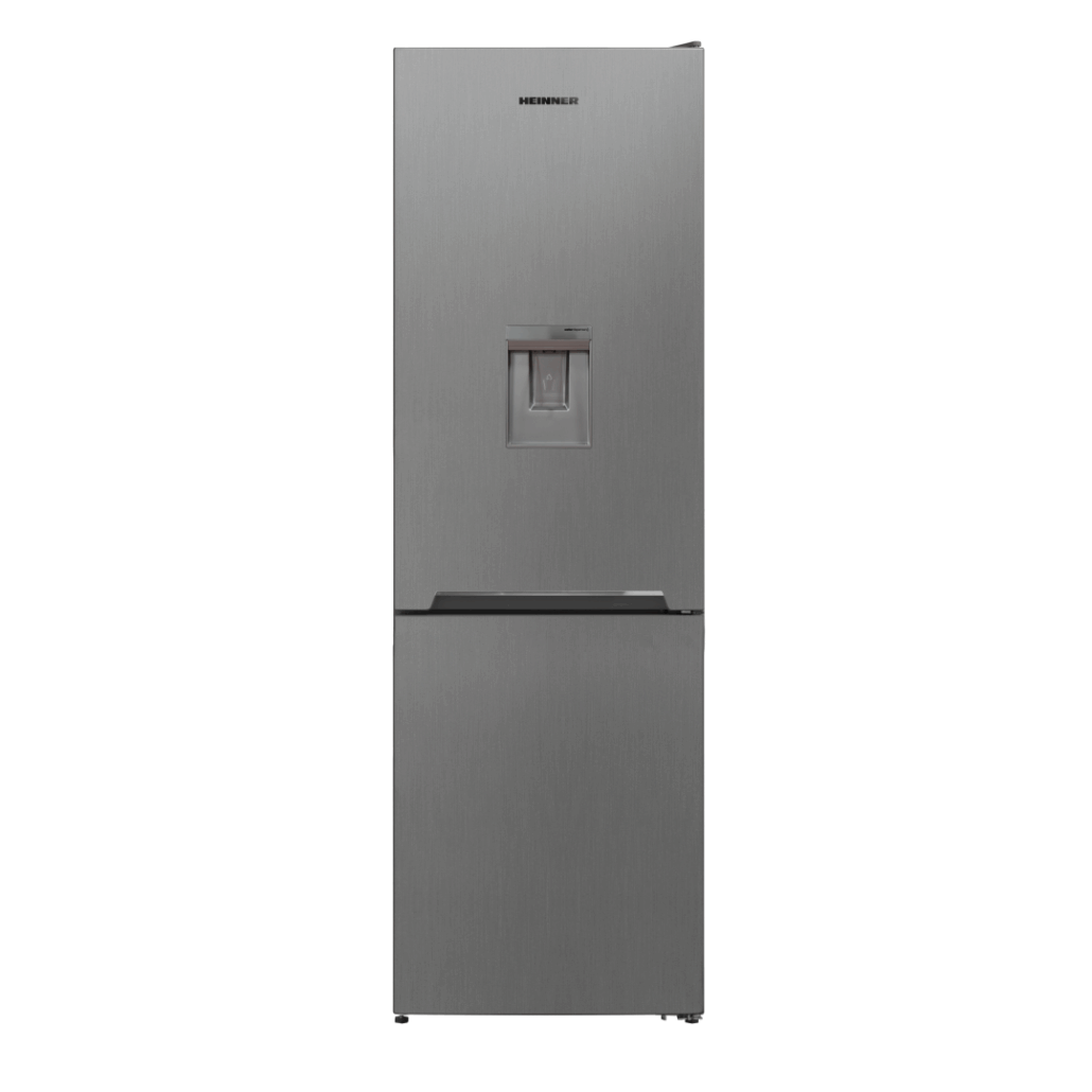 Combina frigorifica Heinner HCNF-V291XWDF+, No Frost Multicooling, Dozator de apa, Clasa energetica F, Capacitate totala: 294 L, Capacitate frigider: 207 L, Capacitate congelator: 87 L, Control electronic cu display in interior, Lumina LED, Functie ECO, Functie congelare rapida, Tehnologie Freezer shield (Rezistenta la frig), alarma usa deschisa, 3 rafturi din sticla frigider, Compartiment convertibil (chiller/fructe si legume), 3 sertare congelator, Suport oua, Tavita cuburi gheata, Capacitate de congelare: 5kg/24h, Dimensiuni (WxDxH): 59.5 x 60 x 186cm, Culoare: Aspect inox cu decoratiune cromata pe maner