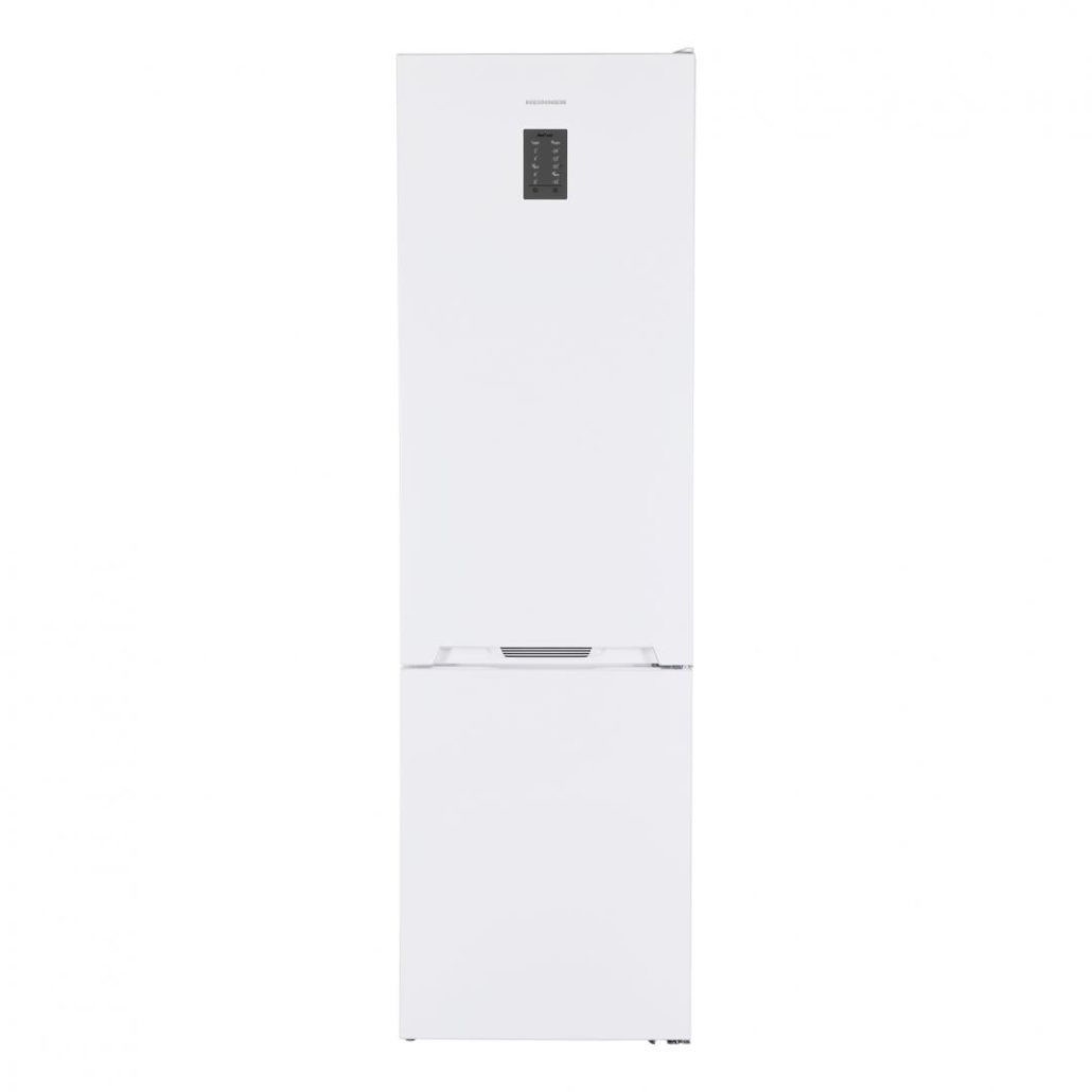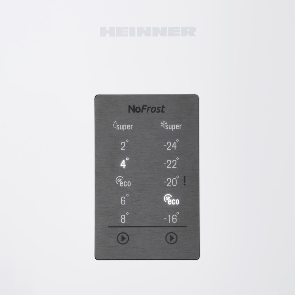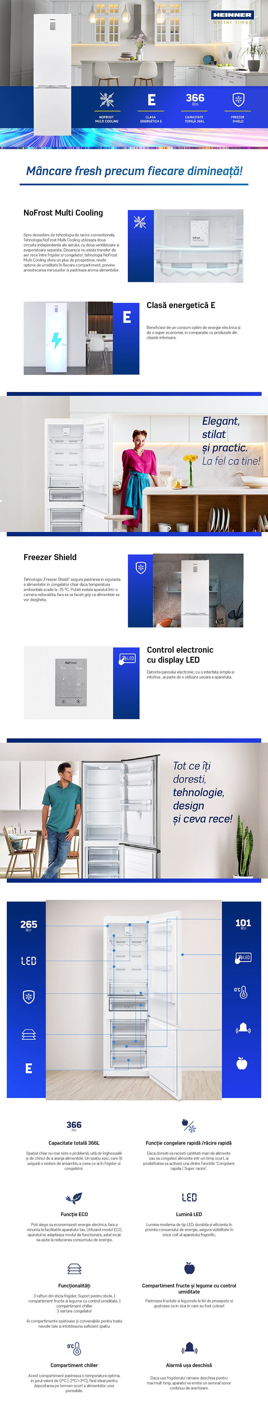 Combina frigorifica Heinner HCNF-V366E++, No Frost Multicooling, clasa energetica E, capacitate totala: 366 L, capacitate frigider: 265 L, Capacitate congelator: 101 L, display pe usa, control electronic, tehnologie Freezer Shield, lumina LED, functie congelare rapida, alarma usa deschisa, sertar Chiller, compartiment fructe si legume cu control umiditate, 3 rafturi din sticla frigider, 3 sertare congelator, suport oua, tavita cuburi gheata, capacitate de congelare: 8kg/24h, dimensiuni (WxDxH): 59.5 x 65 x 201cm, culoare: alb cu decoratiune cromata pe maner