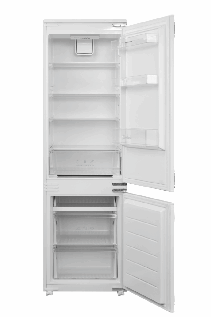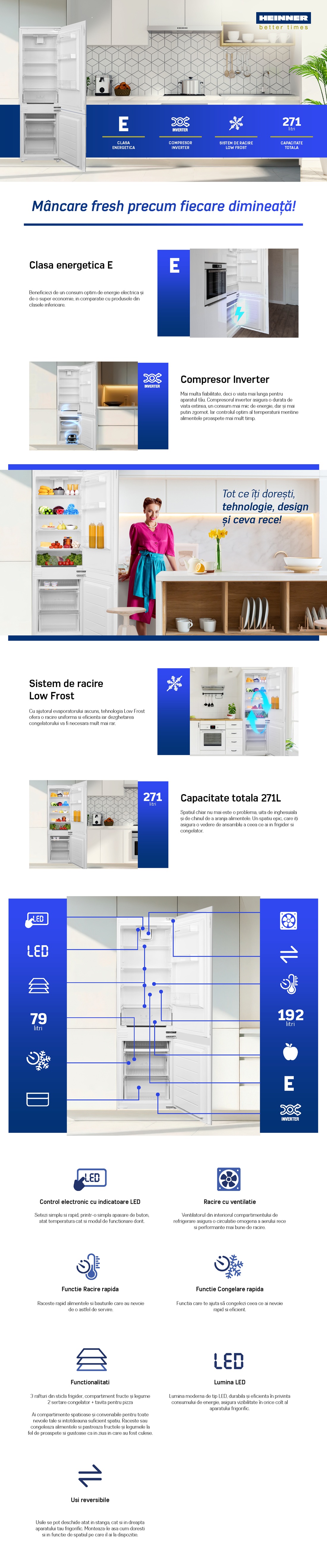 Combina frigorifica incorporabila Heinner HC-BIM271INVE++, sistem de racire Low Frost, clasa energetica E, compresor Inverter, capacitate totala: 271 L, capacitate frigider: 192 L, capacitate congelator: 79 L, panou de control cu indicatoare LED, control electronic, ventilator frigider, functie Super racire, functie Super congelare, lumina LED, compartiment pentru fructe si legume, 3 rafturi din sticla frigider, 2 sertare congelator + tavita pentru pizza, usi reversibile, capacitate de congelare: 3.6kg/24h, dimensiuni (LxAxI): 54 x 55 x 178.5 cm