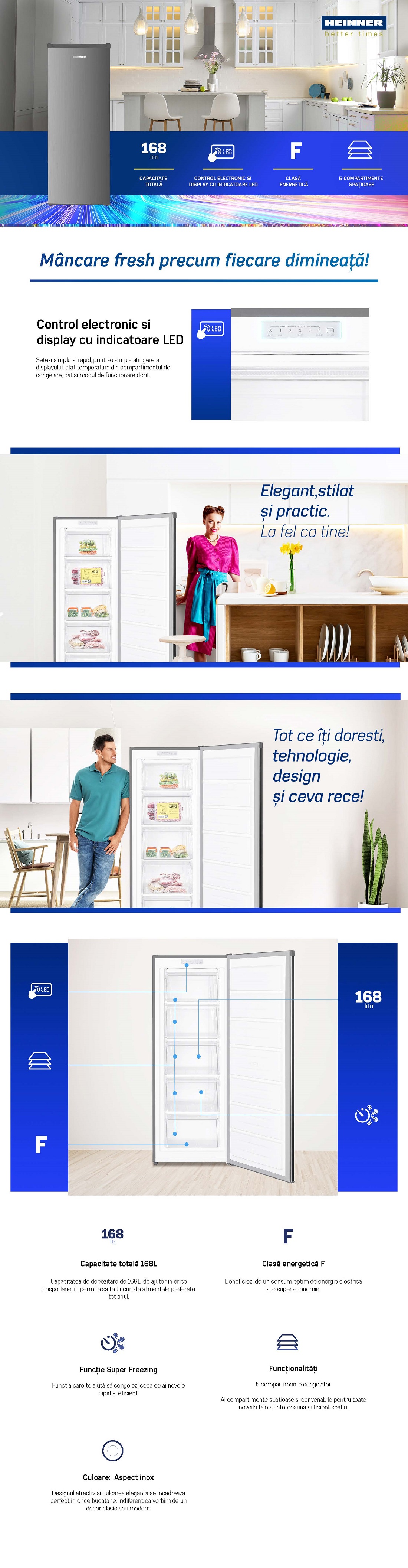 Congelator Heinner HFF-168NHXF+, clasa energetica: F, capacitate totala: 168L, control electronic, afisaj cu indicatoare LED, 5 compartimente, functie Congelare rapida, dezghetare manuala, usa reversibila, capacitate congelare: 7.8kg/24h, nivel de zgomot: 40dB, dimensiuni (WxDxH): 54.4 x 57.1 x 142.6 cm, culoare: Aspect inox