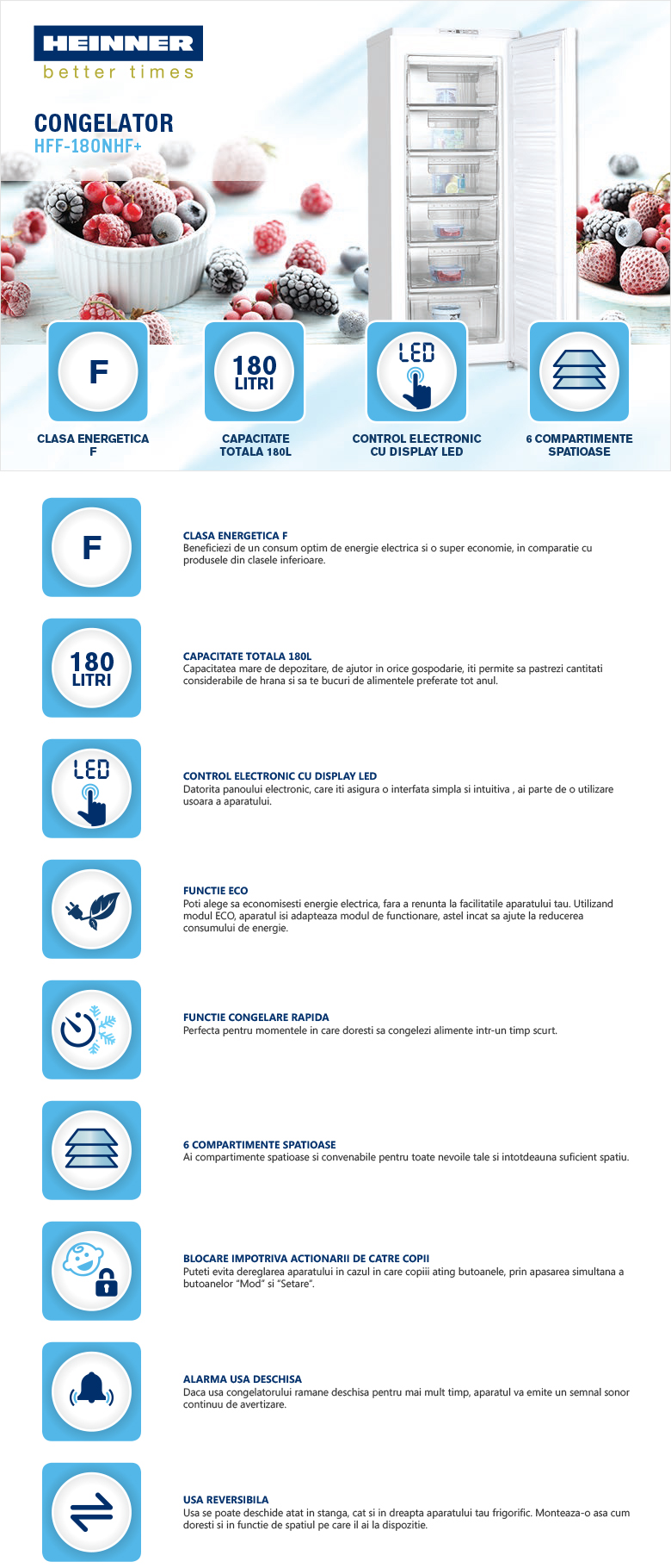 Congelator Heinner HFF-180NHF+, Clasa energetica: F, Display LED, Capacitate totala:180L, Control electronic, Functie congelare rapida, Functie ECO, Alarma usa deschisa, Alarma temperatura ridicata, 6 compartimente congelator, Usa reversibila, Blocare acces copii, Capacitate congelare: 8.2kg/24h, Nivel de zgomot: 40dB, Dimensiuni (WxDxH): 55 x 58 x 143.5 cm, Culoare: alb