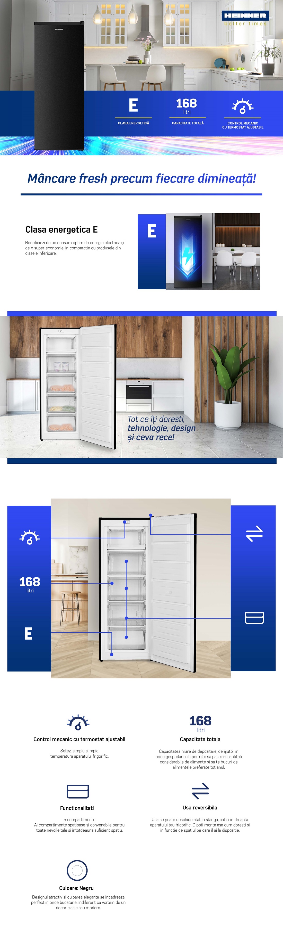 Congelator Heinner HFF-HM168BKE++, clasa energetica: E, capacitate totala: 168L, control mecanic cu termostat reglabil, 5 compartimente congelator, dezghetare manuala, usa reversibila, capacitate congelare: 7.8 kg/24h, dimensiuni: 54.4 x 57.1 x 142.6 cm, culoare: Negru